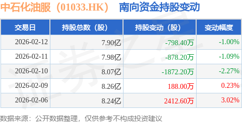 中石化油服(01033.HK):2月12日南向资金减持798.4万股