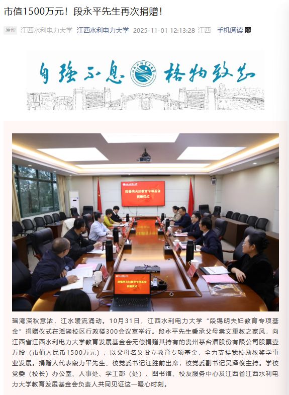 记者 | 金珊 编辑 | 江佩霞 11月1日,据"江西水利电力大学"微信公众号消息,知名投资人段永平向江西省江西水利电力大学教育 发展基金会无偿捐赠其持有的贵州茅台酒股份有限公司股票壹万股(市值人民币1500万元),在捐款 后,段永平还表达了对贵州茅台的信心,他表示:"他们每年花分红就好,市值只是暂时的。" 公开资料显示,段永平的父亲段锡明和母亲彭建华均曾任职于江西水利电力大学(南昌工程学院)。 此前,段永平曾多次在社交平台谈到茅台。如今年6月,他在社交平台发帖称:"贵州茅台,大家在害怕 什么呢?有点意思"。此外,其还与网友就茅台进行频频互动,如今年8月,其回复网友"茅台中报出来 了,你怎么看?"时表示:"茅台中报出来了?有什么好看的?"今年10月,其在社交平台上表示再买茅 台。 近日,贵州茅台披露2025年三季报:第三季度实现营业收入390.64亿元,同比增长0.56%,实现净利润 为192.24亿元,同比增长0.48%。前三季度,贵州茅台实现营收1284.54亿元,同比增长6.36%,实现归 母净利润646.27亿元,同比增长6.25%。 | | | 本报告期 | | 年初至报告期 | | --- | - ...