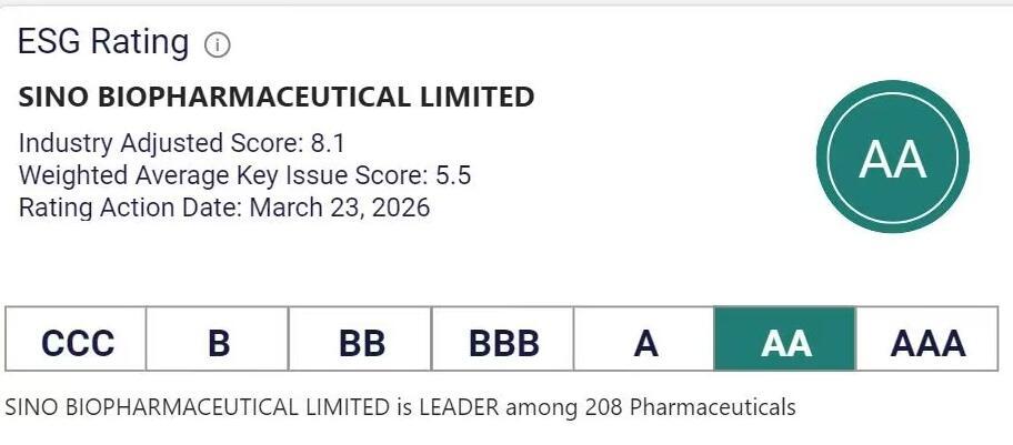 中国生物制药MSCIESG评级跃升至AA,进阶速度超行业平均水平