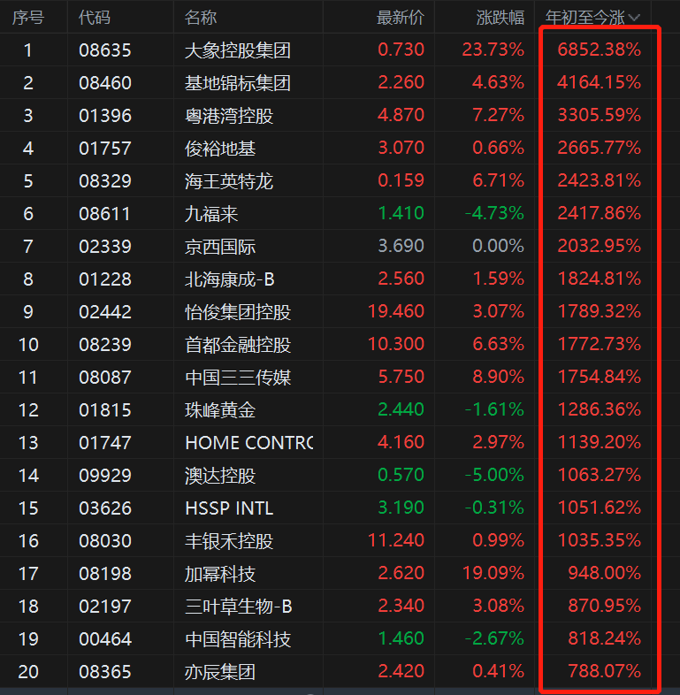 1、超低基数:它们年初股价可能只有几分钱,极小资金就能推动股价翻倍,涨幅百分比"虚高"。 2、非基本面驱动:上涨多由消息炒作、技术性轧空、筹码高度集中后的拉抬等交易性因素导致。 3、极高风险:流动性匮乏,暴涨后极易出现断崖式下跌,且信息不透明,普通投资者难以把握。 港股2025年行情收官,盘点港股市场涨幅之最!历来港股"微型股"或"细价股"的极端涨幅往往让市场"大 惊",其中大象控股集团暴涨6852.38%居首位,基地锦标集团大涨4164.15%,俊裕地基大涨2665.77%,海王 英特龙大涨2423.81%,九福来大涨2417.86%,京西国际大涨2032.95%。 总结来说,这份榜单是"幸存者偏差"的体现: | 序号 | 代码 | 名称 | 最新价 | 涨跌幅 | 年初至今涨▽ | | --- | --- | --- | --- | --- | --- | | 1 | 08635 | 大象控股集团 | 0.730 | 23.73% | 6852.38% | | 2 | 08460 | 基地锦标集团 | 2.260 | 4.63% | 4164.15% | | 3 | 01396 | 粵港湾控股 | 4.8 ...