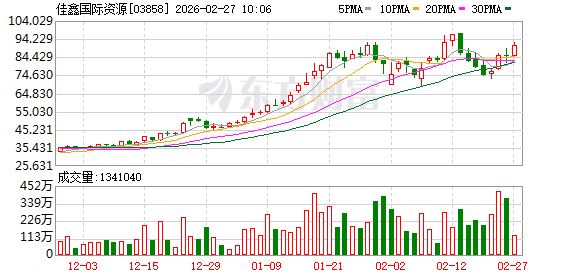 公司股价表现 - 佳鑫国际资源股票代码03858 HK 在2月27日早盘涨幅超过6% [2] - 截至发稿时 股价涨幅为5.12% 报89.25港元 [2] - 当日成交额达到6613.46万港元 [2]