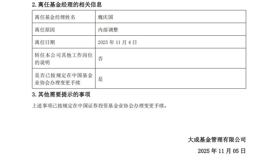 11月5日,大成基金发布公告,基金经理魏庆国因"内部调整"离任大成行业先锋混合(008274),由共同经理于威业独立管理。这是魏 庆国年内第四次退出大成旗下主动权益产品,其所管基金近三年业绩普遍低于业绩基准,最新中报显示行业先锋混合上半年亏损1699 万元。频繁的人事调整,折射出大成基金在业绩压力下的主动权益"瘦身"趋势。 与此同时,大成基金首席权益投资官徐彦管理的多只产品在今年三季度依然未能跑赢基准。以大成睿享混合(008269)为例,报告期A 类净值增长率为9.59%,同期业绩比较基准为11.38%;股票仓位不足六成,现金及结算备付金合计超过三成。在市场反弹阶段,稳健仓 位策略使得基金错过部分进攻性机会,也暴露出公司投研体系防守偏重、风格分散的问题。 | 离任基金经理姓名 | 魏庆国 | | --- | --- | | 离任原因 | 内部调整 | | 离任日期 | 2025年11月4日 | | 转任本公司其他工作岗位 的说明 | 否 | | 是否已按规定在中国基金 业协会办理变更手续 | 是 | 四次解聘成事实,产品业绩连续为负 魏庆国在大成基金任职逾12年,主要管理中小盘、科技和成长主题产品。2025年 ...
