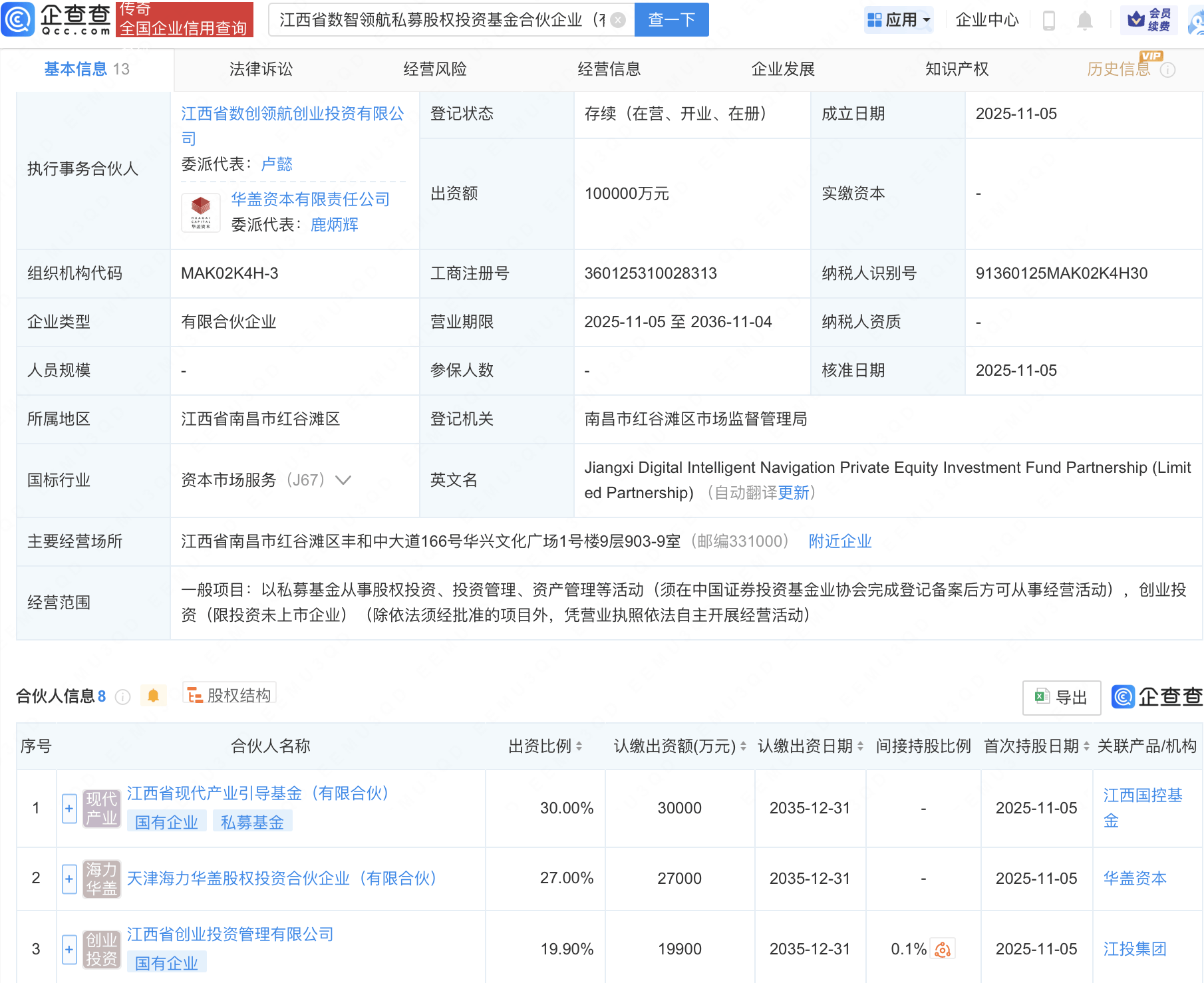企查查APP显示,近日,江西省数智领航私募股权投资基金合伙企业(有限合伙)成立,出资额10亿元,经营范围包含:以私募基金从事股权投资、投资管 理、资产管理等活动。企查查股权穿透显示,该企业由江西省现代产业引导基金(有限合伙)等共同出资。 | 序号 | 合伙人名称 | | 出资比例 ⇒ | 认缴出资额(万元 | | --- | --- | --- | --- | --- | | | 江西省现代产业引导基金(有限合伙) | | 30.00% | 30000 | | | 国有企业 | 私募基金 | | | | 2 | 天津海力华盖股权投资合伙企业(有限合伙) | | 27.00% | 27000 | | | 江西省创业投资管理有限公司 | | | | | 3 | | | 19.90% | 19900 | | | 国有企业 | | | | | 全国企业信用查询 | | 江西省数智领航私募股权投资基金合伙企业(7 8 | 查一下 | | --- | --- | --- | --- | | 基本信息 13 | 法律诉讼 | 经营风险 | 经营信息 | | По 执行事务合伙人 | 江西省数创领航创业投资有限公 委派代表: ...