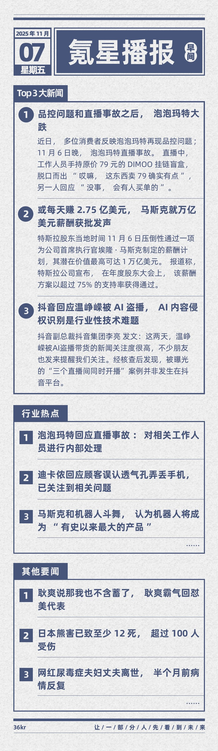 【#氪星播报#|11月7日早间都有哪些#今日大事件#?】 1、#泡泡玛特回应直播事故#:对相关工作人员进行内部处理 2、#迪卡侬回应顾客误认透气孔弄丢手机#,已关注到相关问题 3、#马斯克和机器人斗舞#,认为机器人将成为"有史以来最大的产品" 4、#中国汽车在英国销量暴增235%#,销售了40729辆车 5、#泡泡玛特被大量消费者质疑#:评论区骂声四起 6、#刘强东称未来员工或一周工作一天#,快递配送也不需要人参与 [星星]Top3大新闻 [星星]科技财经互联网热点 [星星]还有哪些其他要闻 1、品控问题和直播事故后,#泡泡玛特大跌# 2、或每天赚2.75亿美元,#马斯克就万亿美元薪酬获批发声# 3、#抖音回应温峥嵘被AI盗播#,AI内容侵权识别是行业性技术难题 迪卡依回应顾客误认透气孔弄丢手机, 2 已关注到相关问题 马斯克和机器人斗舞, 认为机器人将成 3 为"有史以来最大的产品" 其他要闻 耿爽说那我也不含蓄了, 耿爽霸气回怼 1 美代表 日本熊害已致至少 12 死, 超过 100 人 2 受伤 网红尿毒症夫妇丈夫离世,半个月前病 3 情反复 36kr 让 / 一 / 部 / 分 / 人 / 先 / 看 ...
