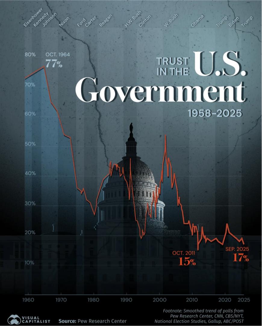美国公众对联邦政府信任度长期趋势 - 美国公众对联邦政府的信任度在1964年达到顶峰,为**77%**,但长期呈现下降趋势,至2025年已跌至**17%**,接近历史最低水平 [1] - 信任度在1970年降至**54%**,并在水门事件后进一步下滑至1974年的**36%** [1] 信任度在危机期间的短期波动 - 尽管长期趋势下降,但在国家危机期间,民众对政府的信任度会出现短暂回升 [1] - 例如,9·11事件后,信任度在短短几个月内从**44%** 跃升至**54%** [1]