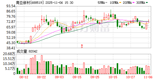 两融数据显示,该股最新融资余额为2.32亿元,近5日增加1732.05万元,增幅为8.06%。 据天眼查APP显示,南亚新材料科技股份有限公司成立于2000年06月27日,注册资本23477.1002万人民 币。(数据宝) 11月6日南亚新材大宗交易一览 南亚新材11月6日大宗交易平台出现一笔成交,成交量40.00万股,成交金额2857.20万元,大宗交易成交 价为71.43元,相对今日收盘价折价1.50%。该笔交易的买方营业部为中信建投证券股份有限公司北京东 三环中路证券营业部,卖方营业部为中信证券股份有限公司上海分公司。 进一步统计,近3个月内该股累计发生3笔大宗交易,合计成交金额为5302.64万元。 证券时报·数据宝统计显示,南亚新材今日收盘价为72.52元,上涨2.62%,日换手率为3.49%,成交额为 6.03亿元,全天主力资金净流入2605.68万元,近5日该股累计上涨0.22%,近5日资金合计净流入646.91 万元。 | 成交量 (万 | 成交金额 | 成交价 | 相对当日收盘 | 买方营业部 | 卖方营业部 | | --- | --- | --- | --- | --- | --- | | ...