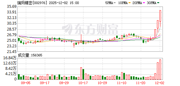 瑞玛精密今日涨停,全天换手率23.98%,成交额5.13亿元,振幅17.44%。龙虎榜数据显示,机构净卖出 1097.96万元,营业部席位合计净买入4143.18万元。 深交所公开信息显示,当日该股因日振幅值达17.44%上榜,机构专用席位净卖出1097.96万元。 瑞玛精密12月2日交易公开信息 | 买/卖 | 会员营业部名称 | 买入金额(万元) | 卖出金额(万元) | | --- | --- | --- | --- | | 买一 | 华鑫证券有限责任公司武汉文治街证券营业部 | 1824.14 | 0.00 | | 买二 | 华鑫证券有限责任公司深圳益田路证券营业部 | 1707.49 | 319.32 | | 买三 | 华鑫证券有限责任公司上海光复路证券营业部 | 1315.85 | 661.35 | | 买四 | 华鑫证券有限责任公司乐清双雁路证券营业部 | 1302.49 | 0.00 | | 买五 | 机构专用 | 1236.67 | 1549.78 | | 卖一 | 机构专用 | 1145.19 | 1873.06 | | 卖二 | 机构专用 | 1236.67 | 1549.78 | | ...