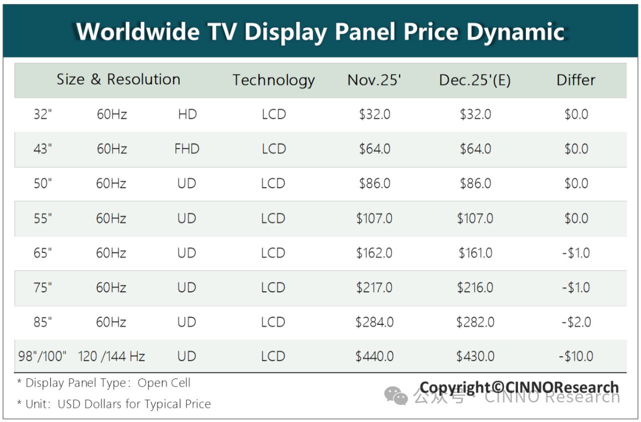 CINNO Research:12月电视面板价格走势分化 中小尺寸企稳大尺寸续跌