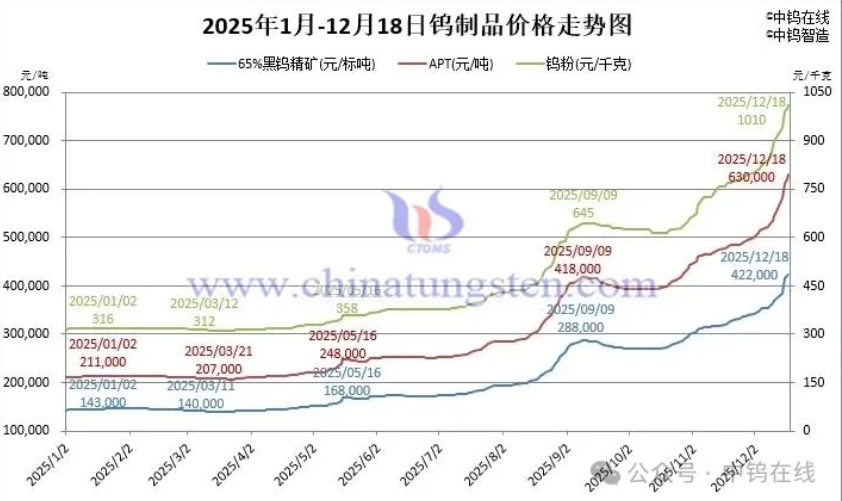 不涨停、不停涨,被称为"工业牙齿"的钨产品,12月以来再次加速上涨。 中钨在线数据显示,截至12月18日,钨精矿、仲钨酸铵、钨粉价格继续上调,其中钨粉(≥99.7%)报价已经达到101万元/吨,较年初涨219.6%;采集的国 产钨粉(≥99.7%)价格,则升至104.5万元/吨,并且上涨速率较11月提升非常明显。 综合多家市场机构反馈,上述产品价格的进一步拉涨,与此前主流企业上调12月上半月长单价格,以及临近年末矿山端检修增多带来的供应收紧有关。 "目前,钨原料供应偏紧因素仍主导市场,消费端弥漫谨慎情绪,导致产业链整体流动性受限,参与者观望江西和广东两地大型钨企的长单价格。"中钨在 线指出。 而以上基本面的强势表现,也映射到了二级市场走势中,近期在多数行业板块回调的背景下,以中钨高新(000657)为代表的钨行业个股逆市上涨。 截至12月17日,在申万划分的31个一级行业中,只有有色金属、国防军工等6个行业板块本月取得正收益,同期钨板块的涨幅又是位居所有细分行业首位。 钨粉暴涨超200% 12月18日上午,章源钨业(002378)官方公众号发布调价通知函,"因钨原材料价格持续上涨,致使公司生产成本大幅增长…… ...