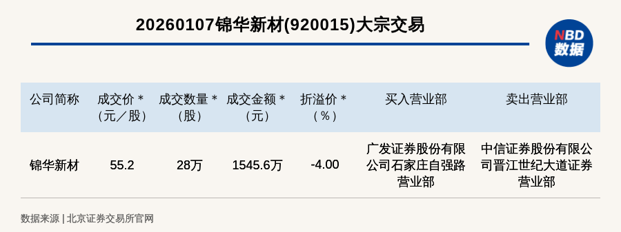 (记者 曾健辉) 免责声明:本文内容与数据仅供参考,不构成投资建议,使用前核实。据此操作,风险自担。 每日经济新闻 每经讯,2026年1月7日,北交所上市公司锦华新材(920015,收盘价:57.5元)发生一笔大宗交易,成交价55.2元/股,成交数 量28万股,成交金额1545.6万元,折价4%。买入营业部是广发证券股份有限公司石家庄自强路营业部,卖出营业部是中信证券 股份有限公司晋江世纪大道证券营业部。 ...