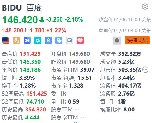 百度(BIDU.US)盘前涨1.22%,报148.2美元。消息面上,1月6日,百度旗下萝卜快跑正式获得迪拜道路 与交通管理局(RTA)颁发的全无人驾驶测试许可,成为迪拜首个且目前唯一获准开展全无人测试的平 台。同日,萝卜快跑在海外建设的首个无人驾驶一体化运营基地于迪拜正式启用。此外,有媒体援引消 息人士称,百度旗下人工智能芯片部门昆仑芯据悉计划通过香港IPO融资至多20亿美元。(格隆汇) | BIDU 百度 | | | | --- | --- | --- | | 146.420 ↓ -3.260 -2.18% | | 收盘价 01/06 16:00 美东 | | 148.200 + 1.780 +1.22% | | 盘前价 01/07 04:00 美东 | | 雪 5 24 4 8 8 8 8 8 0 0 | | ● 快捷交易 | | 最高价 151.425 | 开盘价 149.680 | 成交量 352.82万 | | 最低价 146.350 | 昨收价 149.680 | 成交额 5.23亿 | | 平均价 148.186 | 市盈率 TM 39.07 | 总市值 503.35亿 … | | 振 幅 3. ...