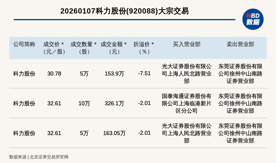 (记者 曾健辉) 免责声明:本文内容与数据仅供参考,不构成投资建议,使用前核实。据此操作,风险自担。 每经讯,2026年1月7日,北交所上市公司科力股份(920088,收盘价:33.28元)发生3笔大宗交易,折价率最高的一笔成交价 30.78元/股,成交数量5万股,成交金额153.9万元,折价7.51%。买入营业部是光大证券股份有限公司上海人民北路营业部,卖 出营业部是东莞证券股份有限公司徐州中山南路证券营业部。 | | | | 20260107科力股份(920088)大宗交易 | | | | | --- | --- | --- | --- | --- | --- | --- | | 公司简称 | 成交价 * | 成交数量* 成交金额 * | | 折溢价 * | 买入营业部 | 卖出营业部 | | | (元/股) | (股) | (元) | ( % ) | | | | 科力股份 | 30.78 | 5万 | 153.9万 | -7.51 | 光大证券股份有限公 司上海人民北路营业 | 东莞证券股份有限 公司徐州中山南路 | | | | | | | में र | 证券营业部 | | | | | | | 国泰海 ...