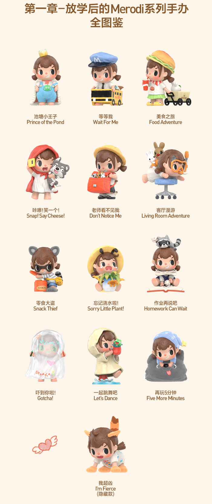 泡泡玛特新品发布 - 公司于2月20日官宣推出全新IP“放学后的Merodi” [1] - 该系列手办包含12个常规款和1个隐藏款 常规款抽取概率为1:12 隐藏款抽取概率为1:144 [1] - 单个盲盒售价为69元人民币 整盒售价为828元人民币 [1] - 线上渠道将于2026年2月26日22时发售 线下渠道将于2026年2月27日发售 [1] 其他IP内容展示 - 文档中提及了其他IP或产品名称 如“零食大盗 Snack Thief” [5] - 文档中展示了多个带有英文翻译的短句或状态 例如“我超凶 I'm Fierce”、“忘记浇水啦 Sorry Little Plant”、“作业再说吧 Homework Can Wait” [7] - 文档中继续展示类似内容 如“吓到你啦 Gotcha”、“一起跳舞吧 Let's Dance”、“再玩5分钟 Five More Minutes” [8]