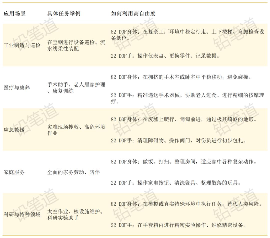 昨天,小鹏汽车发布了新一代机器人IRON,因为太像真人,登上了科技圈头条。 仔细地看,那身材、走路姿态、耳朵形态等,确实像极了真人。要不是小鹏汽车创始人出面,拍了个一镜到底的视频,这波"真人扮演"疑云可能还会持续 很久。 当然,颜值固然重要,但作为科技人,我们更应该其内在含金量:小鹏机器人究竟是什么层次?它的稀缺价值到底在哪?本文将从四个方面阐述。 01 灵活度与精度 首先是身体硬件和设计,比较接近人类的灵活性和执行精度。 它的身体有82个自由度,手部有22个自由度。怎么理解这些数据?知道Tesla Optimus(特斯拉人形机器人)吧?有资料称,它2022年的原型机,身体自由 度大约不超过40个,手部自由度约22个。 当然,毕竟这是3年前的机器了,我们就拿国内最新的机器人来对比。 铅笔道统计下来,国内现有公开发布的机器人中,身体自由度多数在20-50之间,手部自由度很少有超过22的。 那有人会问:追求这些参数有啥用?数值越高,精细操作的能力就越强。 手部22个自由度,已经与人的关节灵活度相当,可以抓握、捏取、旋拧、写字、插拔、精细装配——大部分牛马干的活,机器人都能干了。 为了让大家更好理解,我们列出一组图 ...