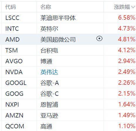 4%,博通、英伟达、谷歌涨超2%。 格隆汇1月2日|美股AI芯片股集体走高,其中,莱迪思半导体涨超6%,英特尔、AMD、台积电涨超 | 代码 | 名称 | | 涨跌幅 √ | | --- | --- | --- | --- | | LSCC | 莱迪思半导体 | | 6.58% | | INTC | 英特尔 | | 4.73% | | AMD | 美国超微公司 | 0 | 4.81% | | TSM | 台积电 | | 4.12% | | AVGO | 博通 | | 2.94% | | NVDA | 英伟达 | | 2.49% | | GOOGL | 谷歌-A | | 2.26% | | GOOG | 谷歌-C | | 2.15% | | NXPI | 恩智浦 | | 1.64% | | AMZN | 亚马逊 | | 1.49% | | QCOM | 高通 | | 1.10% | ...