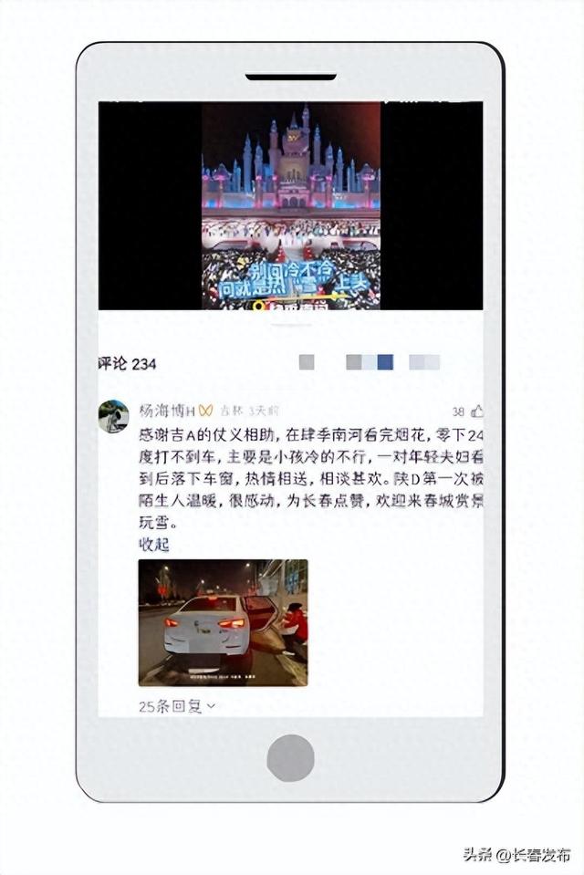 "长春文旅"视频号下 一段留言揭开了 2025年12月31日的长春,严寒未能冰封这座城市的热情。在万众瞩目的肆季南河,一场盛大的粉雪嘉年 华跨年夜活动正火热上演。从傍晚Acappella合唱《大东北我的家乡》点燃全场,到等待零点城堡烟花 秀的人群聚集,上万市民游客在冰雪与欢腾中,共同期盼着新年的到来。 跨年夜一个温暖故事…… 次日凌晨,"长春文旅"视频号"肆季南河冰雪狂欢夜——别问冷不冷,问就是'热'雪"上头!"视频的评论 区,一条被网友点赞置顶的留言写道:"感谢吉A的仗义相助,在肆季南河看完烟花,零下24℃打不到 车,主要是小孩冷得不行,一对年轻夫妇看到后落下车窗,热情相送,相谈甚欢。陕D第一次被陌生人 温暖,很感动,为长春点赞,欢迎来春城赏景玩雪。"留言者杨先生,来自陕西。 ——吉A车主 梁先生 一次萍水相逢的善意搭载,双方并没有留下联系方式。短短一程的温暖相助,梁先生或许已成为杨先生 一家人印象中,真切的长春模样,这座城的热忱与厚道,深深烙进了他们的心底。 联系上吉A车主梁先生时,他有些意外——对他而言,那不过是跨年夜一个再自然不过的举动,从未想 过会被记住。 那天晚上活动还没散场,路边出租车很少。我看 ...