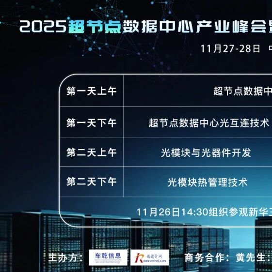 "2025 超节点数据中心产业峰会暨高密度数据中心开发者论坛" 将于 11月26-28日 在浙 江杭州举办(26日14:30预约参观新华三;27-28日为论坛交流)。本次论坛由 车乾信息 &热设计网 主办。论坛重点探讨:超节点数据中心架构设计、互联技术、光模块封装演进 趋势、液冷技术、高导热材料应用等议题。论坛安排1个全体会场2个专题会场进行分类探 讨,预计将邀请 40+ 演讲, 500+ 行业专家参会。 目前报名的主流用户企业: 英伟达,新华三,华为,曙光,浪潮,英特尔,字节,阿里 云,超聚变,燧原,摩尔线程,中兴,烽火,新易盛,锐捷,中国移动,海思光电,剑 桥,光迅,中际旭创等等; 支持媒体: 车乾6G、车乾热管理、热设计网、架构师技术联盟、可鉴智库、傅里叶的猫、 大米的老爹、老张 IT智习社、新材料在线、Leo光通信观察、 莱歌数字、 热管理实验室 ThermalLink、光芯 …… 20+光模块技术演讲信息 智算AI芯片互联协议创新及超节点光互联演进 —— 中国移动研究院 大容量光互连的发展预测及异质集成技术展望 ——四川华拓光通信股份有限公司 —— 上海交通大学 高速光互联市场需求与技术发展趋势 — ...