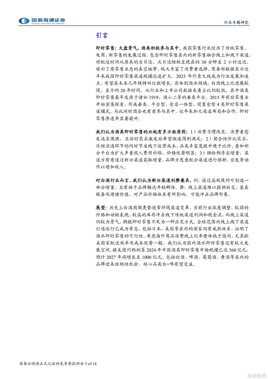 即时零售市场整体规模与增长 - 中国即时零售市场规模在2024年已达7800亿元,同比增长20% [1][26] - 预计2025年市场规模将突破1万亿元,2030年有望达到2万亿元,2024-2030年复合增速约17% [1][26] - 即时零售渠道增速持续快于社会消费品零售总额及实物商品网上零售额增速 [26][29] - 2025年“外卖大战”成为行业发展加速点,三大平台(美团、京东、淘天)加码投入,日订单量峰值近2.5亿,为2024年的2倍以上 [24] 酒类即时零售市场现状与前景 - 2024年中国酒类即时零售市场规模已达360亿元 [3][20][46] - 预计到2027年,酒类即时零售市场规模将攀升至1000亿元,复合增速接近中双位数 [3][20][46] - 酒类即时零售渗透率从2023年的约1%提升至2024年的约2%,预计2027年渗透率将达到6% [44][46] - 白酒和啤酒是核心受益品类 [4][20] 即时零售兴起的驱动因素 - 消费习惯变迁:年轻群体(美团闪购消费者以20-35岁为主)更追求便捷与即时满足 [4][19][51][58] - 性价比优势:压缩流通环节、降低运营成本,叠加平台补贴,价格更具竞争力 [4][19][51] - 供给侧主动求变:渠道方寻求增量,品牌方希望通过新渠道触达更多消费者,尤其是年轻客群 [4][19][51] 酒类即时零售的主要模式与参与者 - 已形成四类运营模式:垂类平台(如1919、酒小二、歪马送酒)、平台型(如美团闪购、京东秒送、淘宝闪购)、仓店一体型(如盒马、永辉)和前置仓型(如叮咚买菜、美团买菜) [4][21][43] - 垂类平台强调专业性和保真服务,而综合平台则多以白酒作为引流工具 [5][43] - 2025年618期间,美团闪购白酒成交额增长超10倍,垂类平台1919成交额增长近5倍,歪马送酒增长超3倍 [44] 白酒行业线上化与即时零售布局 - 白酒线上化进展较慢,2023年线上销售占比约11.9%,2025年1-5月线上销售额占比预计在10%左右,仍有增长空间 [35] - 头部酒企积极布局即时零售,贵州茅台、五粮液、泸州老窖等纷纷与美团、京东、抖音等平台合作,推出“30分钟达”、“小时达”服务 [7][47] - 2025年,茅台酱香酒公司与美团闪购正式合作,超万家终端门店上线 [8][48] - 2025年一季度,多数被调研酒企的线上业务实现持平或正增长,即时零售已成为企业拓展的主要方向之一 [9][49][53] 即时零售对白酒行业的影响与挑战 - 积极影响:通过高效履约创造增量消费场景,并有助于品牌触达年轻消费群体 [14][19][56] - 存在挑战:线上渠道难以提供线下特有的社交体验、鉴真服务和情绪价值 [11][19][57] - 价格管控风险:部分平台低价销售可能冲击价格体系,影响品牌形象,例如飞天茅台在部分即时零售渠道售价波动剧烈,曾引发批价下行 [11][12][57][60] 海外市场借鉴与发展空间 - 海外市场如美国(Drizly、GoPuff)和日本(三得利与7-11合作)已证明酒水即时零售的可行性 [54] - 考虑到海外商品消费线上化率整体低于中国,国内酒水即时零售仍有较大发展空间 [20][54] 投资关注标的 - 报告推荐具备强渠道力和资金实力的全国化名酒及区域龙头,如贵州茅台、山西汾酒、五粮液、泸州老窖、古井贡酒等 [13] - 短期弹性标的关注珍酒李渡、舍得、酒鬼酒 [13] - 啤酒板块推荐青岛啤酒、珠江啤酒、华润啤酒 [13]