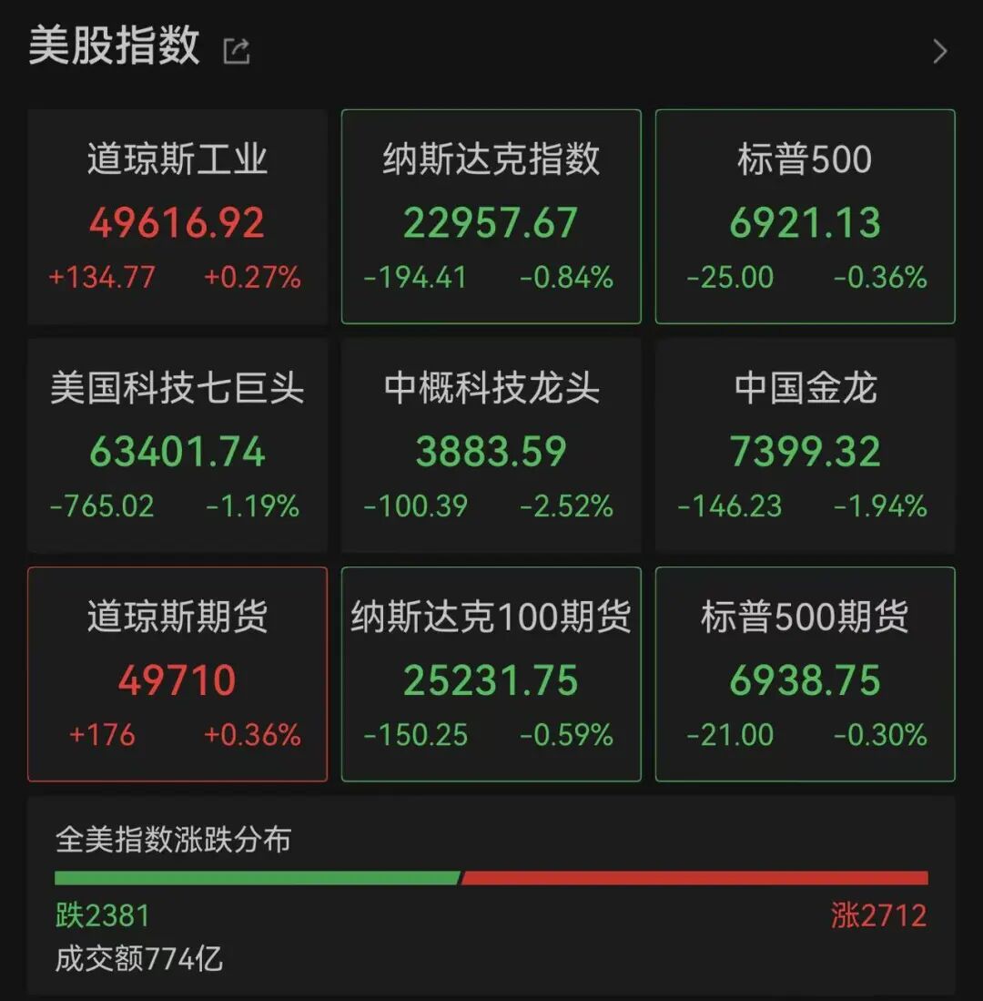 美股市场整体表现 - 北京时间2月26日晚美股开盘涨跌不一,道指涨0.38%,纳指跌0.24%,标普500指数跌0.04% [1] - 截至发稿时主要股指表现分化,道琼斯工业指数报49,616.92点,上涨134.77点,涨幅0.27%;纳斯达克指数报22,957.67点,下跌194.41点,跌幅0.84%;标普500指数报6,921.13点,下跌25.00点,跌幅0.36% [2] - 市场个股涨跌互现,有2,712只个股上涨,2,381只个股下跌,成交额达774亿美元 [2] 科技巨头与中概股表现 - 美国科技七巨头指数下跌765.02点,跌幅达1.19% [2] - 纳斯达克中国金龙指数下跌146.23点,跌幅为1.94% [2] - 热门中概股多数下跌,百济神州跌6.56%,贝壳跌5.85%,百度跌4.83%,瑞幸咖啡跌4.71%,理想汽车跌4.66%,哔哩哔哩跌3.47% [4] - 其他主要中概股亦普遍收跌,阿里巴巴跌2.64%,腾讯控股(ADR)跌2.12%,网易跌1.61%,小米集团(ADR)跌1.57% [5][6][7] 大宗商品市场动态 - 国际银价大幅下挫,COMEX白银期货一度大跌超5%,截至发稿跌幅为4.6%;现货白银一度大跌逾3%,现跌幅为2.55% [8] - 黄金价格小幅跳水,COMEX黄金期货一度跌超1% [8] - 原油价格下跌,WTI原油一度跌近3%,布伦特原油一度跌超2% [10] 地缘政治与机构观点 - 伊朗与美国在瑞士日内瓦举行第三轮间接谈判,谈判主题聚焦于核问题,伊方表示已做好充分准备并寻求解除制裁 [10] - 谈判进程存在不确定性,若能取得进展将缓和地区紧张,若失败则可能导致外交路径中断及军事风险上升 [11] - 美国银行发布报告预测,未来12个月黄金价格有望升至6000美元/盎司 [12] - 美国银行同时指出,白银价格短期内可能进一步回调,但年内仍有机会重新升至100美元/盎司上方 [13]