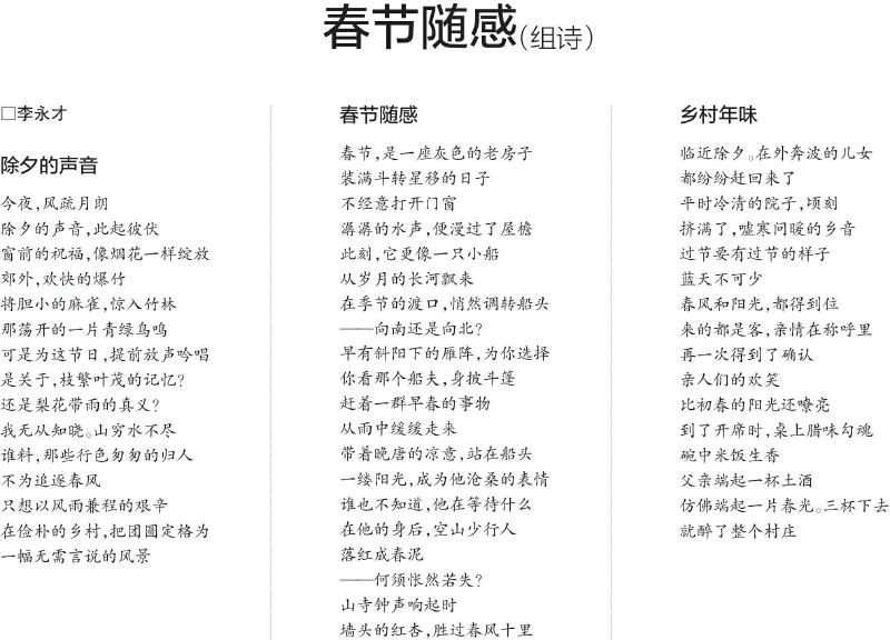 文章核心观点 - 文章为一首描绘中国春节的现代诗歌,通过“除夕的声音”、“春节随感”和“乡村年味”三个场景,艺术化地呈现了节日期间的家庭团聚、乡村传统与时光流转等主题,未涉及任何公司、行业或经济相关论述 [1][2] 根据相关目录分别进行总结 - 文章内容为纯粹的文学创作,不包含任何与公司运营、行业发展、财务数据或市场动态相关的信息 [1][2] - 全文聚焦于个人情感、自然景象与节日氛围的描绘,无商业或投资分析要素 [2]