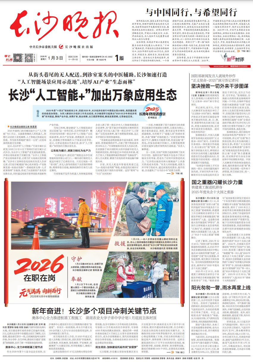 与中国同行,与希望同行 33和平发展的坚定信念,展 (夫兔的大国把在。受累从管词中 timan,为人思和平与发展事业持 的全球系国变展位入新动力。"十四 组建全书 面积字五 给人明书瑞 了中国经济的强大知性。 静的创新活力,这结成为全球经济增长 最大引擎。中国在线色纸或发展道路上 定前行,维本看山成为老团出色。 安布应对年核变化的新一轮圆家自之节 一系列式,常外动动力合建 群众创始人提档,且要步班 在今晚工程 和平与稳定往入正能量。 从街头巷尾的无人配送,到诊室案头的中医辅助,长沙加速打造 人工智能场景应用示范地",培厚AI产业"生态雨林" 人工智能+"加出万象应用生 +四五"报列的官少年,同博2025年,长沙经济在前行由属根州强士朝悼,激励最发展 为深入解读长沙经济工作亮点成效,长沙晚报即日起推出"2025长沙年 长川中国区 合法 %"系列报道,跟焦产业升级、消费扩容,就业保障、出口提质等领域,解读发展逻辑,记录奋进足章。 ■ 长沙晚报全媒体记者 陈星源 2025年最热门的关键词是什么?" 人工程 能"当仁不让。从能政类都的人形相易人 孕 精巧灵活的工业机械骨,人工智能正快递走向 载我。作为技术露帅的"最后 ...