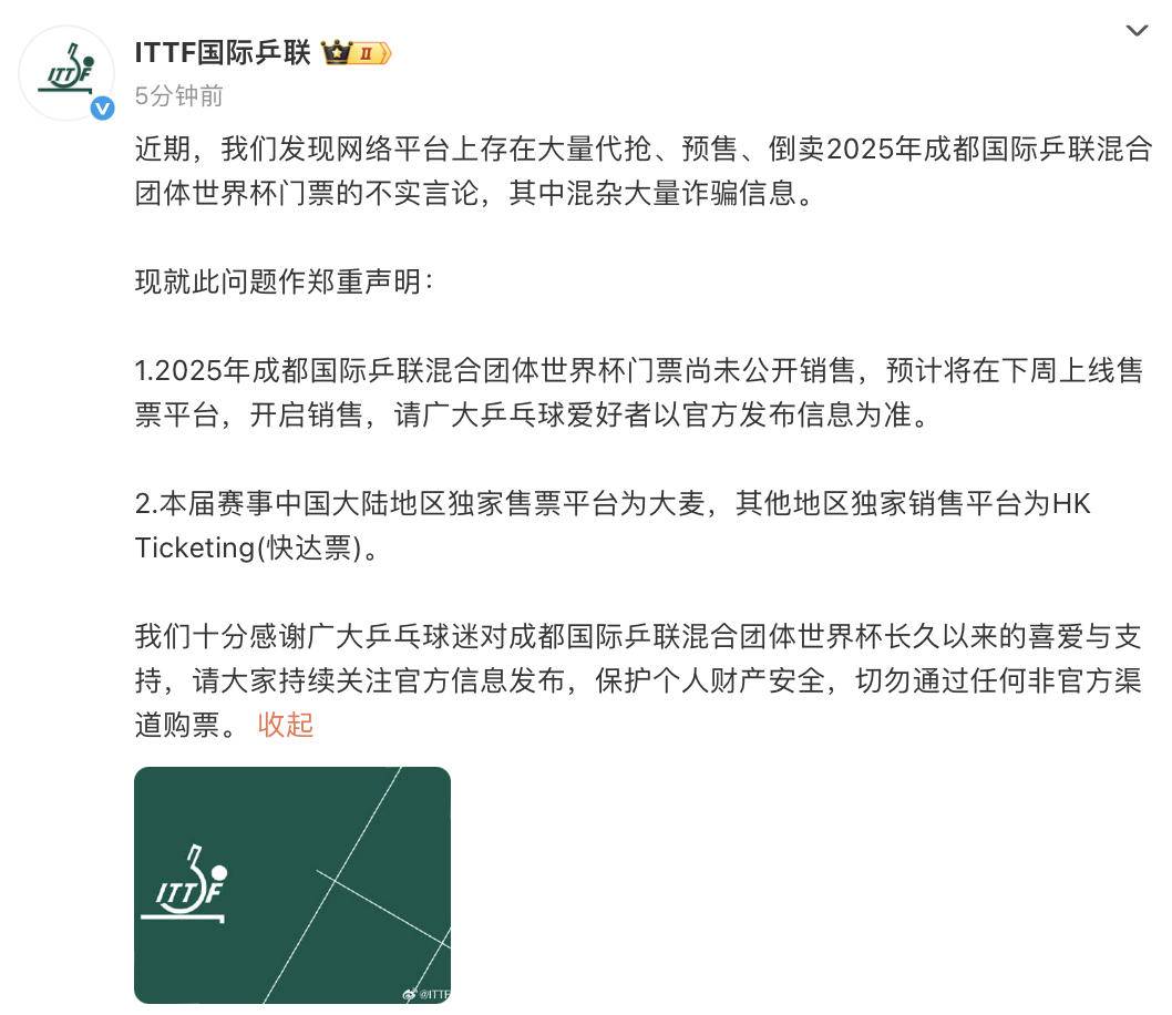 近期,我们发现网络平台上存在大量代抢、预售、倒卖2025年成都国际乒联混合团体世界杯门票的不实言论,其中混杂大量诈骗信息。 现就此问题作郑重声明: 1.2025年成都国际乒联混合团体世界杯门票尚未公开销售,预计将在下周上线售票平台,开启销售,请广大乒乓球爱好者以官方发布信息为准。 2.本届赛事中国大陆地区独家售票平台为大麦,其他地区独家销售平台为HK Ticketing(快达票)。 国际乒联发声明 11月8日,国际乒联官方发布郑重声明,针对网络平台上涌现的大量2025年成都国际乒联混合团体世界杯门票代抢、预售及倒卖不实言论作出回应,明 确此类信息中混杂大量诈骗内容,提醒广大球迷警惕财产风险。 声明原文如下: 我们十分感谢广大乒乓球迷对成都国际乒联混合团体世界杯长久以来的喜爱与支持,请大家持续关注官方信息发布,保护个人财产安全,切勿通过任 何非官方渠道购票。 ...