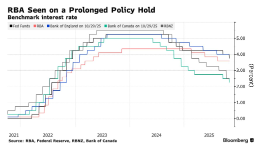 对于本周澳洲联储的议息会议,市场预期十分明确:政策制定者将维持利率不变,且随着经济前景愈发 不明朗,行长米歇尔布洛克预计将避免提供任何前瞻性指引。 一项调查显示,在消费者物价超预期上涨后,经济学家一致预计澳洲联储将在11月3日至4日的会议上, 把现金利率维持在3.6%。隔夜指数掉期市场同样显示,按兵不动几乎已成定局,市场目前仅预计到 2026年中期才有较大可能降息。 "从最新通胀数据来看,澳洲联储短期内大概率难以再次降息,"Jupiter Fund Management驻新加坡投资 组合经理Sam Konrad表示,"澳大利亚经济数据喜忧参半,因此我认为目前没有进一步降息的迫切需 求。当下最重要的是确保通胀得到控制。" 利率决议及声明将于北京时间周二11:30发布,投资者将密切关注委员会投票是否出现异议;与此同时, 澳洲联储还将发布季度经济预测更新。布洛克将在一小时后召开新闻发布会。 在澳洲联储预计按兵不动的几天前,美联储已连续第二次会议下调关键利率。尽管美联储立场偏向鹰 派,但由于就业增长放缓,市场仍认为美联储在12月再次放松政策的可能性较大。 此前,澳大利亚第三季度核心通胀率从修正后第二季度的0.7%升至 ...