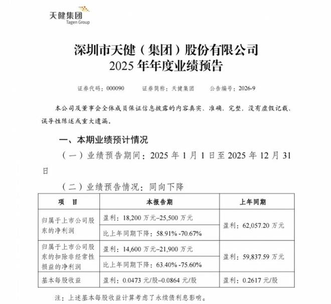 核心观点 - 天健集团2025年业绩预告显示其归母净利润预计为1.82亿元至2.55亿元,同比大幅下降58.91%至70.67%,业绩创近年新低且为连续第三年下滑 [1][2] - 业绩下滑的核心原因是地产业务受到多重压力拖累,包括高毛利项目结转减少、结转毛利率下降以及地产项目减值增加 [3] - 公司面临显著的资金压力,经营活动现金流大幅为负,资产负债率高企,且工程施工业务也因行业资金紧张而加剧了垫资和周转压力 [4] - 尽管面临挑战,但作为深圳国资房企,公司被认为具备一定资源优势,未来若抓住政策窗口、优化业务结构或有望逐步缓解压力 [4][5] 2025年业绩预告详情 - 预计2025年归属于上市公司股东的净利润为1.82亿元至2.55亿元,较上年同期的6.21亿元下降58.91%至70.67% [1] - 预计2025年扣除非经常性损益后的净利润为1.46亿元至2.19亿元,较上年同期的5.98亿元下降63.40%至75.60% [1] - 预计2025年基本每股收益为0.0473元/股至0.0864元/股,上年同期为0.2617元/股 [2] 业绩连续下滑趋势 - 公司净利润已连续第三年下滑 2023年归母净利润为15.17亿元,同比下降22.28% 2024年归母净利润为6.21亿元,同比下降59.09% [2] - 2025年业绩预告的净利润下限(1.82亿元)较2023年高点(15.17亿元)已缩水超过90% [2] 业绩下滑核心原因 - 地产业务是主要拖累,具体表现为本期地产业务高毛利项目结转同比减少,导致核心利润贡献能力大幅减弱 [3] - 受整体房地产行情影响,房地产项目结转毛利率同比下降,同时地产项目减值增加 [3] 公司业务结构分析 - 公司主业为城市建设、综合开发、城市服务,业务结构涵盖建筑施工、房地产开发、物业租赁三大板块 [3] - 从营收占比看,工程施工业务长期维持在60%左右,房地产业务营收占比约30%至35% [3] - 从毛利贡献看,房地产业务是利润核心,近三年其毛利占比始终保持在71%至79%,是决定公司业绩走势的关键板块 [3] 资金与债务状况 - 2025年前三季度,公司经营活动产生的现金流量净额为-9.95亿元,同比大幅下降2236.61%,现金流承压明显 [4] - 截至2025年三季度末,公司资产合计633.47亿元,负债合计484.63亿元,资产负债率达76.50% [4] - 尽管公司已放缓地产开发节奏并加强债务管控,债务规模有所压降,但受行业资金密集型特点影响,债务规模仍处于高位,自由现金流对债务的覆盖能力较弱 [4] 工程施工业务面临的挑战 - 2025年行业下游基建及地产领域资金链偏紧,导致公司施工业务结算进度放缓 [4] - 施工业务垫资压力持续加大,进一步加剧了公司的资金周转压力 [4] 未来发展展望 - 公司作为深圳国资房企,背靠控股股东具备一定的资源优势 [4] - 后续若能抓住行业政策利好窗口,优化项目开发节奏,加快存量项目去化,同时进一步调整业务结构,提升工程施工、城市服务等板块的利润贡献能力,或有望逐步缓解业绩压力 [4] - 短期来看,行业调整尚未结束,公司业绩复苏仍需时间,2026年能否扭转净利润三连降的态势仍有待观察 [5]