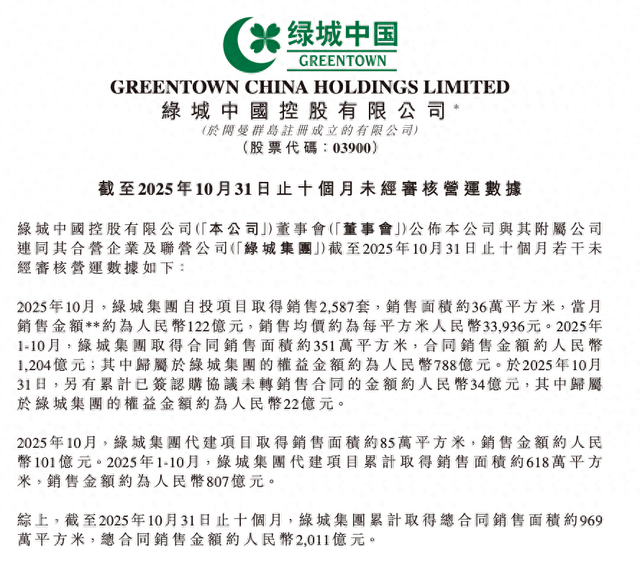 来源:环球网 【环球网综合报道】11月6日,绿城中国控股有限公司公布截至2025年10月31日止十个月未经审核营运 数据。 公告显示,2025年10月,绿城集团自投项目取得销售2587套,销售面积约36万平方米,当月销售金额约 为人民币122亿元,销售均价约为每平方米人民币33936元。 1-10月,绿城集团取得合同销售面积约351万平方米,合同销售金额约人民币1204亿元;其中归属于绿 城集团的权益金额约为人民币788亿元。于2025年10月31日,另有累计已签认购协议未转销售合同的金 额约人民币34亿元,其中归属于绿城集团的权益金额约为人民币22亿元。 截至2025年10月31日止十个月,绿城集团累计取得总合同销售面积约969万平方米,总合同销售金额约 人民币2011亿元。 代建业务方面,2025年10月,绿城集团代建项目取得销售面积约85万平方米,销售金额约人民币101亿 元。1-10月,绿城集团代建项目累计取得销售面积约618万平方米,销售金额约为人民币807亿元。 图源:绿 城中国公告 ...