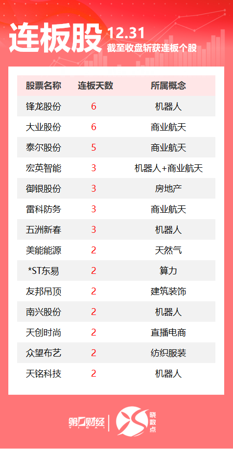 商业航天板块大业股份6连板。一图速览今日连板股>> | 進板股 | -12.31 | | | --- | --- | --- | | | | 截至收盘斩获连板个股 | | 股票名称 | 连板大数 | 所属概念 | | 锋龙股份 | 6 | 机器人 | | 大业股份 | 6 | 商业航天 | | 泰尔股份 | 5 | 商业航天 | | 宏英智能 | 3 | 机器人+商业航天 | | 御银股份 | 3 | 房地产 | | 雷科防务 | 3 | 商业航天 | | 五洲新春 | 3 | 机器人 | | 美能能源 | 2 | 天然气 | | *ST东易 | 2 | 算力 | | 友邦吊顶 | 2 | 建筑装饰 | | 南兴股份 | 2 | 机器人 | | 天创时尚 | 2 | 直播电商 | | 众望布艺 | 2 | 纺织服装 | | 天铭科技 | 2 | 机器人 | 12月31日,Wind数据显示,A股市场共计63只个股涨停。其中机器人板块多股连板,锋龙股份6连板、 宏英智能3连板;商业航天板块大业股份6连板。一图速览今日连板股>> ...