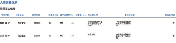 11月7日,宿迁联盛大宗交易成交100万股,成交额880万元,占当日总成交额的9.16%,成交价8.8元, 较市场收盘价8.89元折价1.01%。 | 交易日期 | 证券简称 | 证券代码 | 成交价(元) 成交金额(万元) 成交量(*) 买入营业部 | | | | 类出营业部 | 是否为专场 | | | --- | --- | --- | --- | --- | --- | --- | --- | --- | --- | | 2025-11-07 | 宿迁聚盛 | 603062 | 8.8 | 440 | 50 | รีย์ครั้ง | 去周恩等主义努罗 | | 图 | | 2025-11-07 | 图迁联盛 | 603065 | 88 | 440 | 50 | 机构专用 | 去圓恐寄主婦劈型 | | Ka | ...
