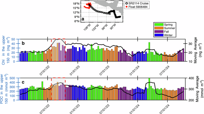 研究数据与方法 - 研究使用了一艘配备生物地球化学传感器的BGC-Argo浮标,该浮标于2021年12月至2022年1月期间在ETNP海域部署,并在2022年1月15日至2024年10月6日近三年期间,每约10天对上层2000米水柱进行剖面观测,共获得97个剖面 [1] - 浮标传感器测量了氧气、硝酸盐、pH、叶绿素荧光、光学后向散射、温度、盐度和压力等参数,所有传感器数据均被用于表征当地生物地球化学特征并作为生物地球化学模型的输入 [1][2] - 研究采用了一种新的统计方法重新分析ISUS硝酸盐传感器的原始输出光谱,以估算亚硝酸盐浓度,该方法使用LASSO回归,包含了硝酸盐、亚硝酸盐和硫代硫酸盐的吸收系数项 [2] - 为评估浮标时间序列期间的当地生产力,研究计算了上层150米深度的颗粒有机碳和叶绿素剖面储量,并应用了6点移动平均来描绘初级生产和颗粒物积累的季节性变化 [3] - 研究计算了变量N*,其公式为 (硝酸盐 + 亚硝酸盐) - 16*磷酸盐 + 2.9 µmol kg⁻¹,其中磷酸盐浓度使用CANYON-B算法估算 [4][10][11] 中尺度和亚中尺度特征识别 - 基于Fiedler & Talley定义的参数,通过生成温盐剖面来识别水团 [5] - 利用通过Ocean Virtual Laboratory组织的卫星汇编数据,识别了浮标所在区域内发生的中尺度海洋学特征,叶绿素-a数据来源于OLCI Sentinel-3卫星 [5] - 针对2022年1月至2024年10月期间每个月中旬的浮标联系,使用每周汇总数据生成叶绿素-a彩色图,以突出涡旋和其他中尺度活动以及生产力的异常 [5] 氮循环生物地球化学箱式模型 - 应用了一个箱式模型来解释从测量的硝酸盐、亚硝酸盐和pH剖面中得出的氮循环速率,该模型旨在量化不同过程对缺氧区氮循环的相对贡献 [6] - 模型前提是,异化硝酸盐还原为亚硝酸盐、通过反硝化作用将亚硝酸盐还原为N₂、亚硝酸盐氧化和厌氧氨氧化等过程,通过消耗质子和/或产生溶解CO₂与无机碳酸盐化学相关联 [6] - 在运行模型前,基于氧跃层中溶解无机氮和溶解无机碳相对于磷酸盐的回归,确定了有机物质的化学计量比为C₁₁₃.₁HₐO_bN₁₁.₂₃P,并用于推导模型中的反应系数 [7][12] - 通过比较模型预测的硝酸盐、亚硝酸盐、N*、总碱度和DIC的变化与观测到的分布,来求解异化硝酸盐还原为亚硝酸盐、反硝化、亚硝酸盐氧化、厌氧氨氧化和碳酸钙溶解等过程的贡献 [7] - 将BGC-Argo数据根据初级生产力的变化划分为三个循环周期,并进一步将每个周期划分为八个密度层,从而创建了24个反应平衡大致恒定的箱体 [9] - 第一个周期为2022年1月至11月,其特征是亚硝酸盐浓度高(>2 µmol kg⁻¹);第二个较短的周期为2022年7月至10月,其特征是持续的高颗粒有机碳生产;第三个周期为2022年11月至2024年1月,期间观测到低至检测不到的亚硝酸盐浓度 [9] - 通过稳健的Huber's T回归量化每个箱体中硝酸盐、亚硝酸盐、N*和总碱度相对于DIC的斜率,以最小化异常值的影响,然后利用反应化学计量学求解每个反应对DIC生产/消耗的相对贡献 [10] - 通过执行蒙特卡洛模拟来量化模型不确定性,从正态分布中选取10,000个观测斜率值,该分布的均值和标准差等于示踪剂浓度相对于DIC斜率的均值和标准差 [11] - 实验测定的有机物质碳氮磷比为113.1 ± 0.5 : 11.23 ± 0.06 : 1,表观耗氧量与磷的比为112.2 ± 0.2 : 1,碳氧化态为0.83 ± 0.02 [12][13] - 使用双样本t检验来量化不同周期之间反应重要性的统计学显著差异,显著性评估中p < 0.001被认为具有统计学差异 [14] 模型局限性 - 模型结果假设每个密度定义的水层内处于稳态条件,这意味着在水团停留期间生物地球化学过程是稳定的,但中尺度涡旋活动或季节性生产力波动等瞬变事件可能短暂违反这些稳态假设,从而给反应速率估计带来不确定性 [15] - 碳酸盐饱和度面的变异性表明,中尺度涡旋驱动的扰动在与ΩAr = 1面相关的上层密度层最为明显,而在更深密度层的变异性相对有限,这意味着瞬态非稳态效应主要影响上层缺氧区 [15] - 有机物质的化学计量比可能存在显著变化,这将影响基于化学计量学的模型结果,此外,模型未包含自养反硝化和异化硝酸盐还原为铵等额外过程,纳入这些过程可能会改变观测到的过程平衡 [15] 基于稳态示踪剂模型的反应速率估算 - 使用浮标的硝酸盐、亚硝酸盐和DIC垂直剖面,通过一个稳态一维示踪剂守恒模型来估算生物地球化学转化速率,该模型平衡了垂直涡流扩散与生物地球化学反应 [16] - 对于每个剖面,通过求解公式 dC/dt = 0 = 生产 + Kz * d²C/dz² 来计算速率,其中C是示踪剂浓度,Kz是垂直扩散系数,基于Whalen等人的研究结果,在该区域缺氧区典型深度(约250米)假设为3 × 10⁻⁶ m² s⁻¹ [16][17] - 生产或消耗速率计算为:速率 = -Kz × ∂²C/∂z² × 86400 (单位:mmol m⁻³ d⁻¹),为改善缺氧区内生物地球化学特征的对齐,在密度空间中分析剖面 [17] - 该方法得出了与Kz不确定性相关的转化速率时空估计,不确定性范围约为3倍 [17]