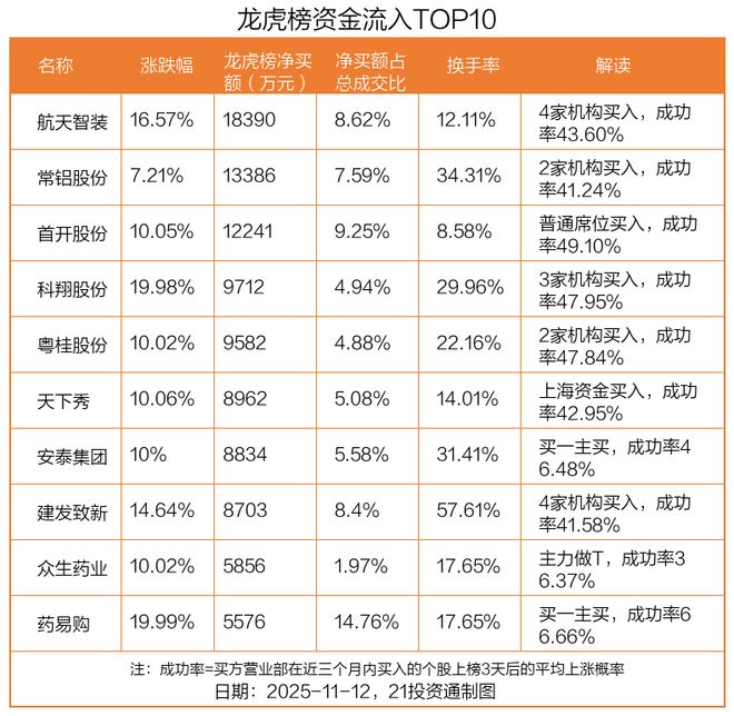 11月12日,上证指数下跌0.07%,深证成指下跌0.36%,创业板指下跌0.39%。盘后龙虎榜数据显示,共 有47只个股因当日异动登上龙虎榜,资金净流入最多的是航天智装(300455.SZ),达1.84亿元。 据21投资通智能监测,33只个股龙虎榜出现了机构的身影,北向资金参与龙虎榜中的个股共涉及13只。 1.84亿资金抢筹航天智装,2.22亿资金出逃亿晶光电 47只上榜的龙虎榜个股中,22只个股被净买入,25只个股被净卖出。其中,资金净买入最多的是航天智 装,达1.84亿元,占总成交金额的8.62%。航天智装当日收盘上涨16.57%,换手率为12.11%。 | 名称 | 涨跌幅 | 戊席榜净买 | 净买额占 | 换手率 | 解读 | | --- | --- | --- | --- | --- | --- | | | | 额(万元 | 总成交比 | | | | 航天智装 | 16.57% | 18390 | 8.62% | 12.11% | 4家机构买入,成功 率43.60% | | 常铝股份 | 7.21% | 13386 | 7.59% | 34.31% | 2家机构买入,成功 率41.24% | | ...