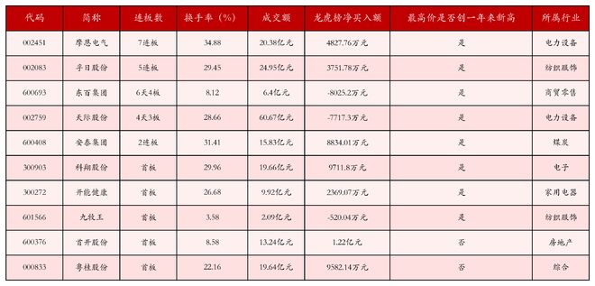 一、强势个股 截至11月12日收盘,上证综指下跌0.07%,收于4000.14点,深证成指下跌0.36%,收于13240.62点,创 业板指下跌0.39%,收于3122.03点。今日沪深两市A股共计77只涨停,综合当前连板数以及当日龙虎榜 数据,其中较为强势的前三只个股分别为:摩恩电气(002451)、孚日股份(002083)与东百集团 (600693)。今日强势个股前10位具体数据见下表: | 保码 | 隔称 | 连板数 | 换手率(%) | 成交额 | 龙虎特净买入额 | 最高价是否创一年来新高 | 所属行业 | | --- | --- | --- | --- | --- | --- | --- | --- | | 002451 | 摩恩电气 | 7连板 | 34.88 | 20.38亿元 | 4827.76万元 | 是 | 电力设备 | | 002083 | 字日股份 | 5连板 | 29.45 | 24.95亿元 | 3751.78万元 | 是 | 防禦服饰 | | 600693 | 东百集团 | 6天4板 | 8,12 | 6.4亿元 | -8025.2万元 | 是 | 商贸本信 | | 00275 ...