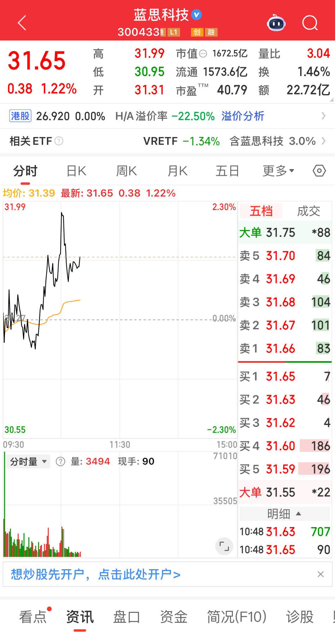 扬子晚报网11月7日讯(记者 范晓林 薄云峰 实习生 潘伊笑)11月6日,在具身智能整机制造领域规模化量产的具有综合实力的蓝思科技(300433)宣布, 越疆机器人近日向蓝思科技下达10000台四足机器狗整机组装订单。 | 蓝思科技▽ | | | | | | | --- | --- | --- | --- | --- | --- | | 3004330 LT 创 融 | | | | | | | 吧 | 31.65 | 31.99 市值⊙ 1672.5亿 量比 | | | 3.04 | | 低 | | 30.95 流通 1573.6亿 换 | | | 1.46% | | 0.38 1.22% サ | | 31.31 市盈 40.79 额 | | 22.72亿 | | | 港股 26.920 0.00% H/A 溢价率 -22.50% 溢价分析 | | | | | | | 相关ETF ? | | VRETF -1.34% 含蓝思科技 3.0% > | | | | | 更多。 HK | 分时 | 周K 五日 | | | | | 均价: 31.39 最新: 31.65 0.38 1.22% | | | | | | | ...