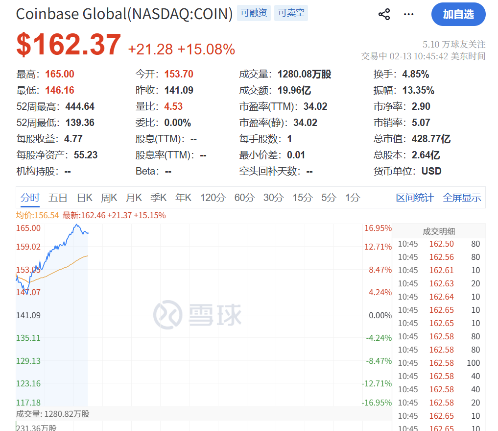 美股市场与宏观经济 - 2月13日晚间美股三大指数走势震荡 [1] - 美国1月CPI环比上涨0.2%,同比上涨2.4%,均低于市场预期的0.3%和2.5% [1] - 1月核心CPI环比上涨0.3%,同比上涨2.5%,符合市场预期 [1] - 市场策略师认为通胀报告缓解了投资者对AI冲击的担忧,并为美联储提供了略微偏向“鸽派”的理由,但通胀率仍远高于央行目标 [1] Coinbase公司财务与运营 - Coinbase第四季度营收为18亿美元,同比下降20%,降幅超出预期 [2] - 公司第四季度录得净亏损6.67亿美元,主要原因是计入其持有的加密货币及投资浮亏(减值) [2] - 公司交易量萎缩,交易收入面临压力,业务对数字资产价格波动及零售投机行为高度敏感 [2] - 在财报发布前数周,随着加密市场情绪恶化,公司股价已大幅下挫 [2] Coinbase股价与市场表现 - 财报发布后,Coinbase股价反弹约15%至162美元左右 [2] - 该股在反弹前一交易日(周四)曾下跌约8% [2] - 过去一年中,Coinbase股价累计跌幅约达50% [2] - 2月13日交易时段,该股最高价165.00美元,最低价146.16美元,开盘价153.70美元,前收盘价141.09美元 [3] - 当日成交量为1280.08万股,成交额为19.96亿美元 [3] - 该股52周最高价为444.64美元,52周最低价为139.36美元 [3] - 公司市盈率(TTM)为34.02 [3] 加密货币市场动态 - 2月13日加密货币市场出现反弹,是当晚美股市场的亮点之一 [1] - 比特币迎来五个交易日以来的首次上涨 [3] - Coinbase股价通常与比特币走势挂钩,比特币占据了整个加密货币市场约60%的市值 [3] - 黄金、白银的价格震荡上涨 [4]