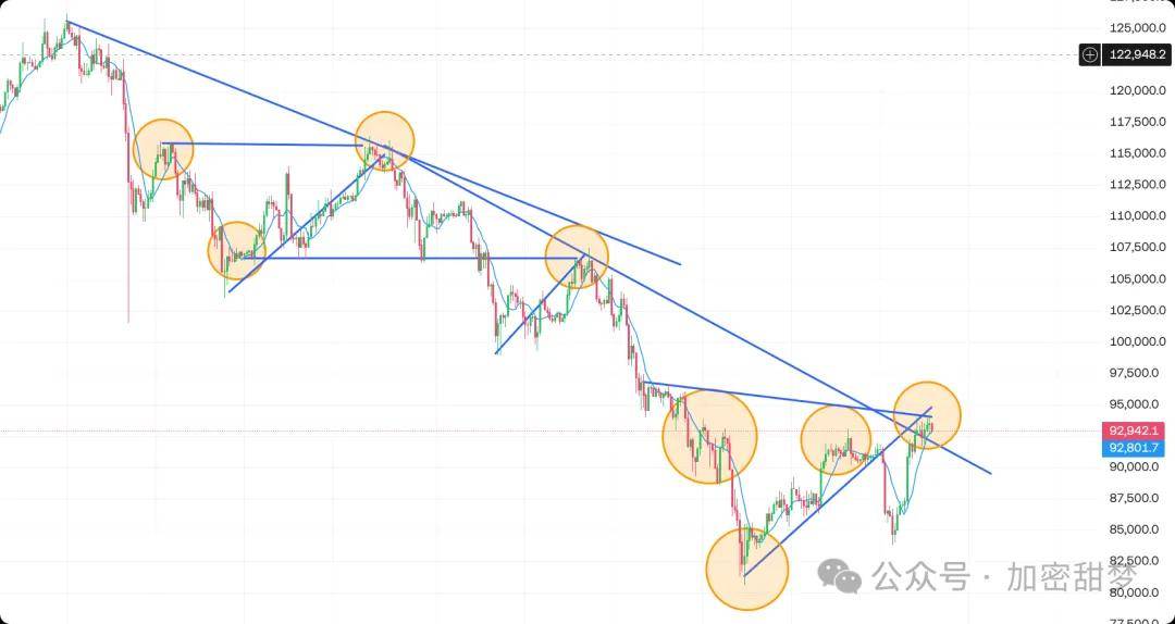 加密市场继续回暖。BTC已连续3日修复,重回93k,接近30日均线94k。这或许和美联储QT结束、宏观流动性宽松等利好有关。 CEX 山寨跟随大盘,昨天只有机器人赛道的sapien 拉翻倍了,其余都是弱势拉升,不过有数据的山寨还不错,比如 ena hype pump 等; BTC BTC93-93.8K 关键价格区间,阻力位动能减弱,震荡通道上涨,潜在的极速通道模型,三段式回踩反弹,前两次都是触及下跌趋势线附近下跌,这次呢? 第一次下跌后反弹12%,耗时10天; 第二次下跌后反弹10%,耗时一周; 第三次下跌后反弹16%目前,耗时12天 ETH BTC现阶段还是围绕前期震荡区间93000附近,上方筹码密集区在96000附近,当前走降息反弹行情,反弹幅度较大,虽然有机会,但追高需谨慎。 ETH这波属于4h级别主升浪上涨形态,也可以理解成w底 ,这波高点预计在分割线1.618附近,对标价格3380-3400区间,计划在这个位置进场做空,短期 不要进场做空了。 从清算地图上看,上方有清算96000附近需求,而下方有回踩9万、8.8万的需求,一般关键位都会反复磨后才会突破,关键位也是机会位。 目前ETH到比较强的压力 ...