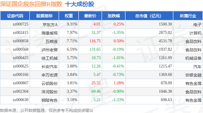 资金流向方面,深证国企股东回报R(470064)指数成份股当日主力资金净流出合计5.27亿元,游资资金 净流入合计1.28亿元,散户资金净流入合计3.99亿元。成份股资金流向详情见下表: 证券之星消息,11月7日,深证国企股东回报R(470064)指数报收于2289.78点,跌0.1%,成交245.19亿 元,换手率0.91%。当日该指数成份股中,上涨的有20家,江苏国泰以10.01%的涨幅领涨,下跌的有28 家,佛燃能源以4.13%的跌幅领跌。 深证国企股东回报R(470064)指数十大成份股详情如下: | 证券代码 | 股票简称 | 权重 | 最新价 | 涨跌幅 | 总市值(亿元) | | 所属行业 | | --- | --- | --- | --- | --- | --- | --- | --- | | sz000725 | 京东方A | 9.31% | 4.01 | 0.25% | | 1500.30 | 电子 | | sz002415 | 海康威视 | 7.97% | 31.37 | -1.35% | | 2875.02 | 十算机 | | sz000858 | 五根液 | 7.71% | 116. ...