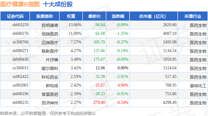 证券之星消息,11月7日,医疗健康R(480016)指数报收于7535.01点,跌0.39%,成交218.69亿元,换 手率0.89%。当日该指数成份股中,上涨的有26家,新和成以4.9%的涨幅领涨,下跌的有23家,泽璟制 药以4.35%的跌幅领跌。 医疗健康R(480016)指数十大成份股详情如下: | 证券代码 | 股票简称 | 权重 | 最新价 | 涨跌幅 | 总市值(亿元) | 所属行业 | | --- | --- | --- | --- | --- | --- | --- | | sh603259 | 药明康德 | 13.66% | 94.84 | -0.89% | 2829.80 | 医药生物 | | sh600276 | 恒瑞医药 | 11.00% | 61.58 | -1.35% | 4087.19 | 医药生物 | | sz300760 | 迈瑞医疗 | 7.57% | 205.79 | -0.27% | 2495.08 | 医药生物 | | sh688271 | 联影医疗 | 4.27% | 137.66 | -0.10% | 1134.54 | 医药生物 | | sh600436 | 片 ...