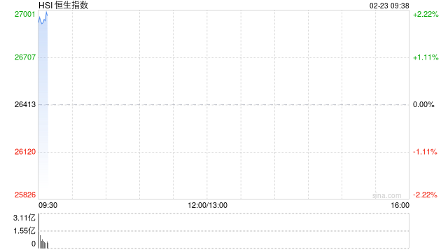 港股市场整体表现 - 2月23日港股三大指数开盘集体拉升,恒生指数最新报26943.13点,上涨529.78点,涨幅为+2.01% [1][3] - 恒生中国企业指数最新报9144.91点,上涨185.35点,涨幅为+2.07% [1] - 恒生科技指数表现最为强劲,最新报5347.67点,上涨136.17点,涨幅达+2.61% [1][3] 主要成分股表现 - 恒生指数成分股中,紫金矿业涨幅领先,上涨超过5% [1][3] - 美团股价上涨超过4% [1][3] - 中芯国际、京东、网易、舜宇光学科技等科技及互联网公司股价均上涨超过3% [1][3]