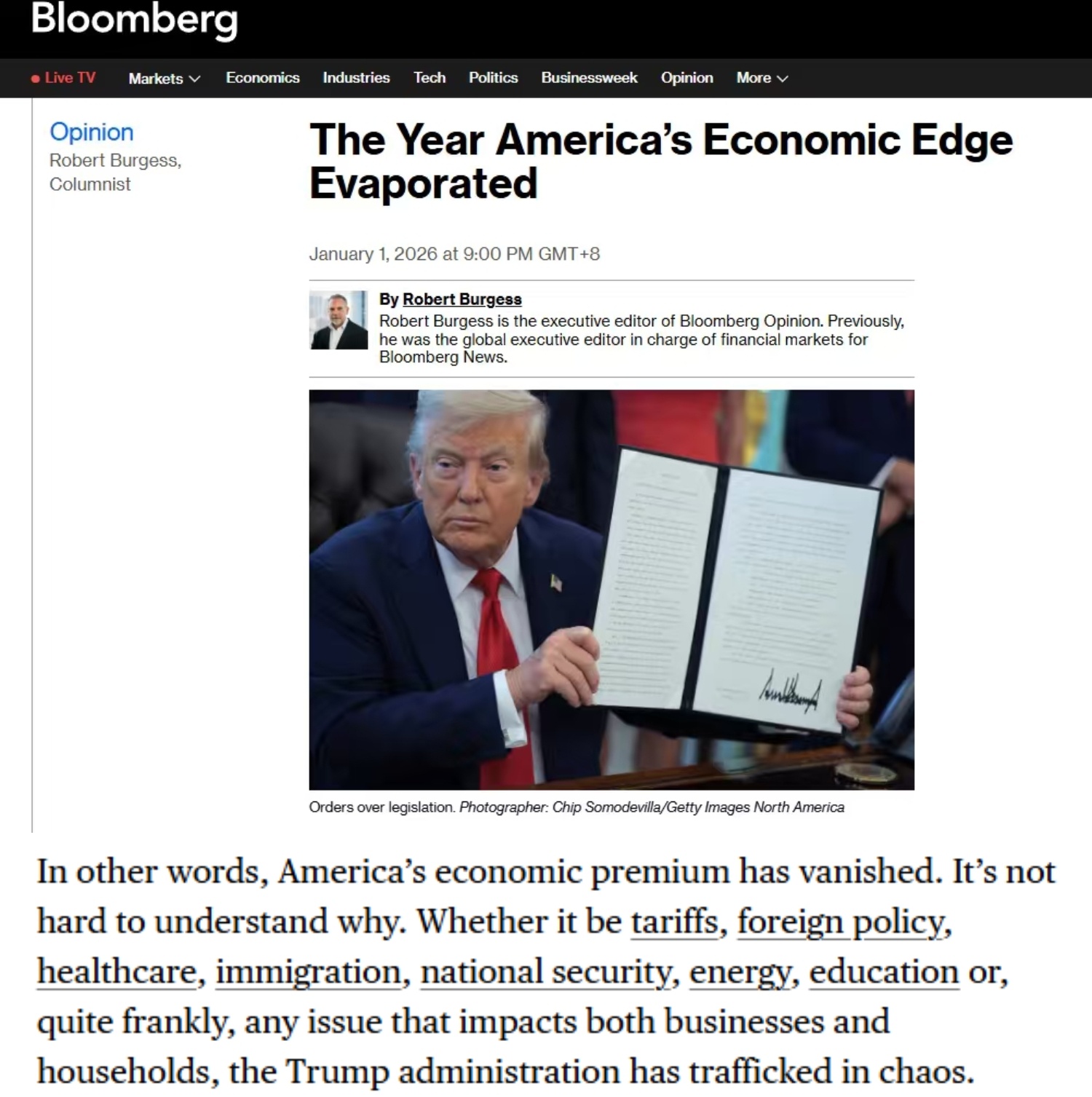 彭博社近日刊文称,美国经济优势已消失殆尽。文章分析认为这一现象的产生并不难理解。无论是在关税政策、外交事务、医疗体系、移民问题、国家安 全、能源战略、教育等诸多领域,抑或是任何切实影响企业与民众生活的议题,美国政府的执政轨迹始终与混乱相伴。 彭博社报道截图 文章认为,美国家庭财务状况日趋紧张。文章称,有证据表明,随着收入增长陷入停滞,美国人正动用储蓄来维持消费支出。此外,当政策走向难以预测 时,企业几乎无法制定可靠的经营计划。文章援引美国杜克大学和里士满联邦储备银行对全美首席财务官的最新调查显示,当前商界对经济前景并不乐观。 作为就业增长引擎的小型企业正面临严峻挑战。文章援引美国一家公司发布的数据称,去年11月,无论是商品生产还是服务行业的私营企业都在大规模裁 员。其中员工规模少于50人的企业削减了12万个岗位,创下自2020年5月以来最大的单月裁员纪录。 文章还关注到,虽然一些上市公司在盈利方面表现强劲,但其他大多数企业情况却并非如此。根据摩根大通发布的数据显示,截至去年六月美国企业的年度 收益收缩了5.6%。一位受访者这样描述现状:"当前经济活动明显缺乏活力,我们认为这完全与华盛顿方面制造的混乱和不确定性 ...