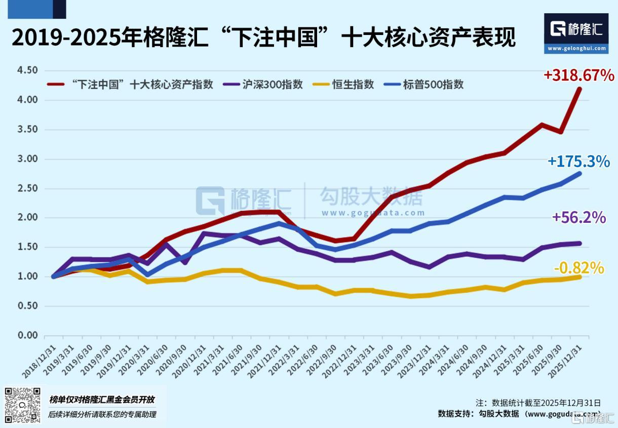 文章核心观点 - 格隆汇通过全球七十多国数千万会员票选,发布了2026年度“下注中国”十大核心资产名单,旨在利用集体智慧锚定中国未来核心资产 [1] - 该评选活动已连续举办7年,其历史业绩表现突出,2019-2025年十大核心资产指数累计涨幅达318.67%,大幅跑赢同期沪深300指数(+56.2%)、恒生指数(-0.82%)和标普500指数(+175.3%)[3] - 2025年单年,十大核心资产等权重组合收益率达35.1%,同样跑赢沪深300指数(+17.7%)、恒生指数(+27.8%)和标普500指数(+17.3%)[3] - 入选公司需符合四大原则:代表中国、代表未来中国经济方向、具备头部竞争壁垒、在2026年大概率具备20%或以上的市值增长空间 [2][6] - 十大资产均以中国市场为根基,覆盖AI算力、新能源、消费、金融、生物医药等关键赛道,国际业务仅作为国内核心竞争力的延伸 [14] 评选背景与原则 - 2025年中国投资市场充满“变数”,包括美联储降息摇摆、地缘局势、房地产企稳疑云、AI泡沫争议、新能源景气转向等,市场起伏考验投资者判断 [2] - 评选基于全球七十多国数千万会员的投票,无任何人为干预,旨在凝聚集体智慧穿越市场迷雾 [3] - 名单已于2025年12月15日向旗舰会员提前披露,并采用“季度动态调整”机制以灵活适配市场变数 [5] 十大核心资产核心逻辑梳理 1. 中际旭创 (300308) - 核心逻辑:受益于2026年国内AI算力基建加速及“东数西算”工程,预计拉动180亿元光模块采购需求,行业量价齐升 [5] - 行业与产品:800G光模块国内需求年增50%,1.6T产品进入量产高峰期,国内订单同比增长120% [5] - 公司地位:全球龙头,800G/1.6T产品市占率超40%,铜陵基地逐步释放1.6T产能 [5] - 盈利与估值:1.6T产品溢价较800G高20%-30%,券商中性预测其2026年市值增长25%-30% [5] 2. 腾讯控股 (00700.HK) - 核心逻辑:立足国内庞大用户基数,微信月活13.8亿,社交护城河深厚,是数字经济赋能民生的核心载体 [6] - 业务增长点:视频号日活突破5亿,日均使用时长超70分钟,2026年广告收入规模有望突破400亿元,AI提效放大流量变现 [6] - 游戏业务:以国内为基本盘,收入增长15%,核心聚焦国内版号优化与精品内容迭代 [7] - 盈利与估值:广发证券预测公司2026年经调整归母净利2950-2980亿元,对应上行空间25%-30% [7] 3. 阿里巴巴 (09988.HK) - 核心逻辑:锚定国内AI+云与大消费双主线,阿里云收入预计达1700亿元,增速维持34% [7] - 业务发展:千问大模型深度服务超2000家国内企业客户,国内即时零售业务亏损收窄50%,笔单价环比上涨超10% [7] - 市场定位:海外业务占比不足10%,仅为国内核心能力的延伸 [7] - 盈利与估值:摩根士丹利给出中性展望,预测其股价仍有25%-28%上行空间 [7] 4. 黄金ETF (518880) - 核心逻辑:作为国内投资者核心避险工具,适配2026年国内市场波动环境,中信证券预测金价有望冲击5000美元/盎司 [8] - 支撑因素:美联储降息传导至国内、地缘风险外溢下国内避险情绪升温、全球央行购金趋势 [8] - 产品规模:截至2025年12月29日,该ETF规模达965.61亿元,稳居国内同品类首位,近20日资金净流入18.18亿元 [8] - 市场展望:券商中性判断其资金承接规模同比增长28%-32% [8] 5. 洛阳钼业 (603993/03993.HK) - 核心逻辑:深度绑定国内新能源产业链,钴、铜作为动力电池核心原材料,受益于国内新能源汽车渗透率提升 [9] - 产量目标:2026年公司铜产量目标66万吨、钴产量12万吨,稳居全球第一 [9] - 客户与市场:钴产品主要供应宁德时代、比亚迪等国内动力电池龙头 [9] - 盈利预测:测算显示全年归母净利润有望达320-350亿元,券商中性展望其市值对应2026年PE12-15倍 [9] 6. 中国平安 (601318/02318.HK) - 核心逻辑:受益于国内降息周期与股市慢牛共振,险资权益资产配置比例提升至25%,预计增厚投资收益110-130亿元 [10] - 保险业务:银保渠道保费增速维持30%以上,分红险保费占比升至45%,寿险新业务价值同比修复15% [10] - 生态与风控:“保险+康养”生态落地30余家高端机构,地产减值规模同比收窄60% [10] - 资本与估值:核心偿付能力充足率保持200%以上,券商中性预测其2026年市值增长20%-25% [10] 7. 东方财富 (300059) - 核心逻辑:受益于2026年资本市场活跃度提升,全年成交额预计突破300万亿元 [11] - 业务发展:AI财富管家用户目标达500万,基金代销市占率提升至6.5%,证券手续费收入增长18%,基金销售服务费增速22% [11] - 技术赋能:AI投研系统缩短报告生成时间60%,养老金融用户破100万 [11] - 估值展望:机构预测其2026年合理股价中枢为22-25元区间,对应市值中性增长22%-28% [11] 8. 万华化学 (600309) - 核心逻辑:扎根国内化工产业升级赛道,MDI产能达450万吨/年,全球市占率超35% [12] - 市场需求:受益于国内家电以旧换新政策,拉动MDI内需增长12% [12] - 新材料布局:POE新材料产能15万吨/年填补国内空白,磷酸铁锂产能20万吨/年对接国内动力电池需求 [12] - 盈利与估值:申万宏源上调其2026年归母净利润至155-162亿元,瑞银给出中性估值,市值区间2800-3200亿元 [12] 9. 药明合联 (02268.HK) - 核心逻辑:立足国内创新药研发浪潮,ADC领域承接国内药企创新需求,在研管线中超60%服务国内客户 [13] - 行业地位:国内ADC领域龙头,市占率超15%,研发投入占比25% [13] - 业务发展:XDC技术突破填补国内高端服务空白,全年新增ICMC项目超40个,订单增长主要由国内需求驱动 [13] 10. 携程集团 (09961.HK) - 核心逻辑:深耕国内出行消费市场,受益于国内消费复苏与文旅升级,国内休闲旅游收入占比达65% [14] - 运营数据:通过AI技术