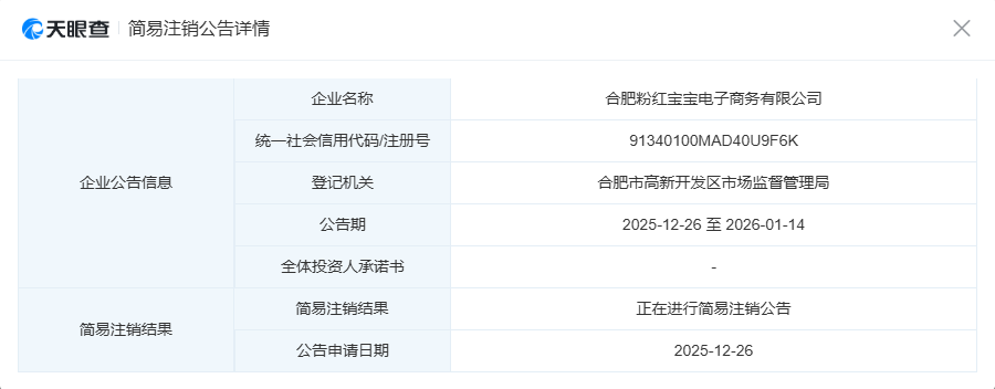 主播&直播间 1、三只羊旗下粉红宝宝电商公司拟注销 天眼查App显示,近日,合肥粉红宝宝电子商务有限公司新增1条简易注销公告,公告期为2025年12月26日至2026年1月14日。 | | there references in the results of | For I Study of Cabonable and of Property and of Property of Property of | | --- | --- | --- | | | 统一社会信用代码/注册号 | 91340100MAD40U9F6K | | 企业公告信息 | 登记机关 | 合肥市高新开发区市场监督管理局 | | | 公告期 | 2025-12-26 至 2026-01-14 | | | 全体投资人承诺书 | | | 简易注销结果 | 简易注销结果 | 正在进行简易注销公告 | | | 公告申请日期 | 2025-12-26 | 该公司成立于2023年11月,法定代表人为李莹,注册资本100万人民币,经营范围包括个人商务服务、个人互联网直播服务、组织文化艺术交流活动、文化 娱乐经纪人服务等。股东信息显示,该公司由合肥三只羊 ...