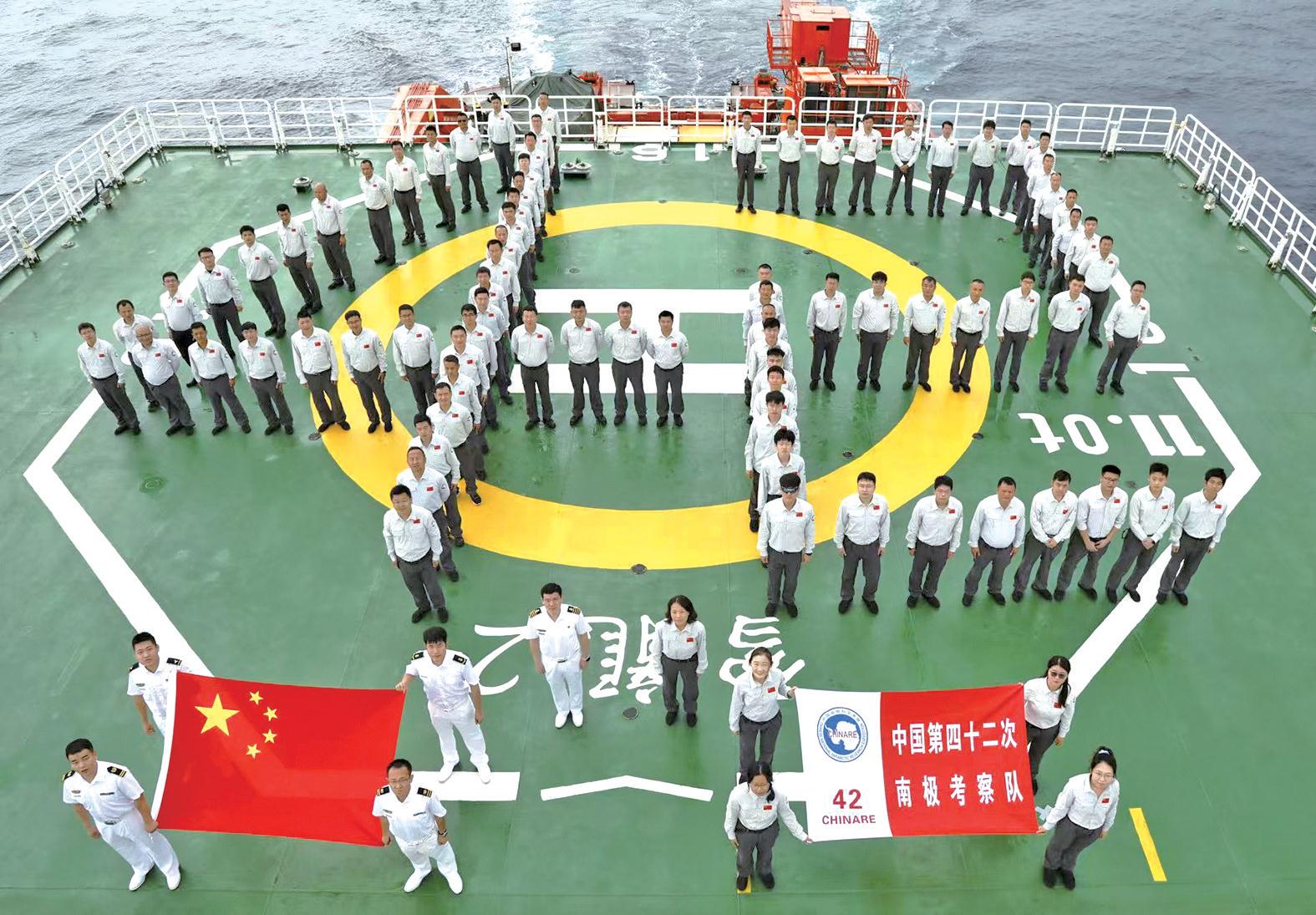 按照惯例,考察队在飞行平台甲板上举行了一系列穿越赤道纪念活动。目前,船舶航行正常,预计将于本月底到达我国南极中山站。图为考察队员 在"雪龙2"号上合影留念。 北京时间11月9日2时21分,正在执行中国第42次南极考察任务的"雪龙2"号极地考察船穿越赤道进入南半球。 ...