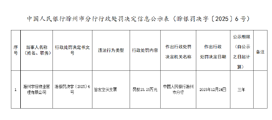 12月31日金融一线消息,中国人民银行滁州市分行行政处罚决定信息公示表显示,滁州宇恒物业管理有 限公司因签发空头支票,被处以罚款23.25万元。 12月31日金融一线消息,中国人民银行滁州市分行行政处罚决定信息公示表显示,滁州宇恒物业管理有 限公司因签发空头支票,被处以罚款23.25万元。 | 序 름 | 当事人名称 (姓名、职务) | 行政处罚决定书文 | 동 | 连法行为类型 | 行政处罚内容 | 作出行政处罚 | 作出行政 | 公示期限 (自公示 | 备注 | | --- | --- | --- | --- | --- | --- | --- | --- | --- | --- | | | | | | | | 决定机关名称 | 处罚决定日期 | 之日起计 | | | | | | | | | | | 39) | | | 1 | 新作宇恒物业管 理有限公司 | 版银河决字〔2025〕6 | ਛੇ | 去发空头支票 | 司数23.25万元 | 中国人民银行激州 中行行 | 2025年12月24日 | 三年 | | 责任编辑:王馨茹 | 序 ਫੇ | 当事人名称 (姓名、职务) | 行政处罚决定书文 | 봄 | ...