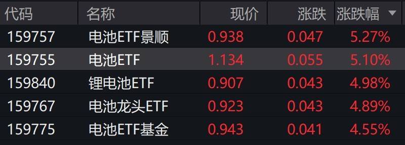 电池概念股早盘大涨,天赐材料涨停,华友钴业涨超6%,赣锋锂业涨超5%,宁德时代、先导智能、国轩高科涨 超4%。 有分析认为,近年来,政策支持为电池行业发展注入了强劲动力。国家持续推出新能源汽车鼓励政策,包括以旧 换新、充电基础设施建设及新能源下乡等,进一步释放了消费潜力。同时,"反内卷"政策的逐步落地促使行业竞 争趋于理性,整体盈利环境有望改善。 受盘面影响,电池相关ETF涨约5%。 每日经济新闻 | 代码 | 名称 | 现价 | 涨跌 涨跌幅 | > | | --- | --- | --- | --- | --- | | 159757 | 电池ETF景顺 | 0.938 | 0.047 | 5.27% | | 159755 | 电池ETF | 1.134 | 0.055 | 5.10% | | 159840 | 锂电池ETF | 0.907 | 0.043 | 4.98% | | 159767 | 电池龙头ETF | 0.923 | 0.043 | 4.89% | | 159775 | 电池ETF基金 | 0.943 | 0.041 | 4.55% | ...