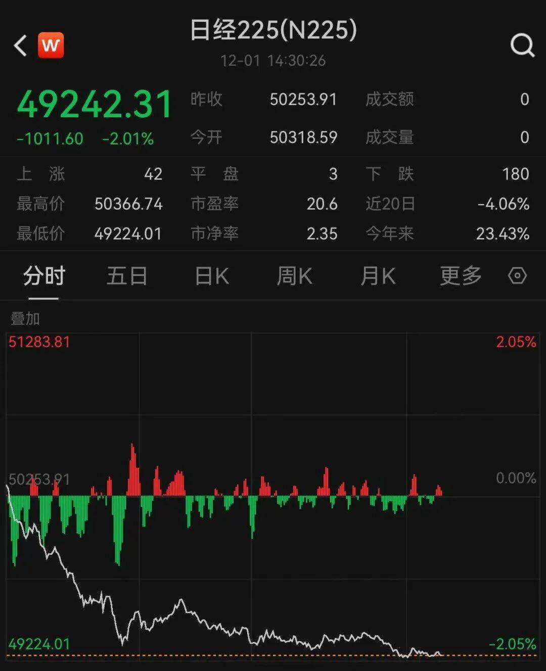 日本国债因加息预期重燃而暴跌。 今天日本债券市场上,3个月国债收益率暴涨超34%,作为长期利率指标的10年期新发国债收益率一度升至1.840%, 这 是自2008年6月以来的最高水平。 与此同时, 日经225指数高开低走,盘中跌幅超2%,跌超千点。 | < W | | | 日经225(N225) | | Q | | --- | --- | --- | --- | --- | --- | | 12-01 14:30:26 | | | | | | | 49242.31 | | 昨收 | 50253.91 | 成交额 | 0 | | -1011.60 -2.01% | | 今井 | 50318.59 | 成交量 | 0 | | 上 涨 | 42 | 中 香 | 3 | 下 跌 | 180 | | 最高价 | 50366.74 | 市盈率 | 20.6 | 近20日 | -4.06% | | 最低价 | 49224.01 | 市净率 | 2.35 | 今年来 | 23.43% | | 分时 | 五日 | 日K | 高K | 月K | 日名 0 | | 叠加 51283.81 | | | | | 2.05% | | | ...