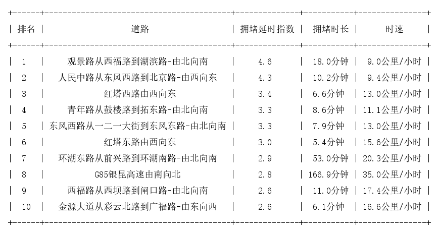 | 排名 | | 道路 | 拥堵延时指数 | | 时速 | | --- | --- | --- | --- | --- | --- | | | | 观景路从西福路到湖滨路-由北向南 | 4. 6 | 18.0分钟 | 9.0公里/小时 | | 2 | | 人民中路从东风西路到北京路-由西向东 | 4. 3 | 10.2分钟 | 9.4公里/小时 | | 3 | - | 红塔西路由西向东 | 3. 4 | 6.6分钟 | 13.0公里/小时 | | 4 | | 青年路从鼓楼路到拓东路-由北向南 | 3. 3 | 8.6分钟 | 11.1公里/小时 | | 5 | | 东风西路从一二一大街到东风东路-由北向南 | 3. 3 | 7.9分钟 | 13.0公里/小时 | | 6 | | 红塔东路由西向东 | 3.0 | 5.4分钟 | 15.6公里/小时 | | 7 | | 环湖东路从前兴路到环湖南路-由北向南 | 2. 9 | | 53.0分钟 20.3公里/小时 | | 8 | | G85银昆高速由南向北 | 2. 8 | 166.9分钟 | 35.0公里/小时 | | ರಿ | | 西福路从西坝路到闸口路-由北 ...
