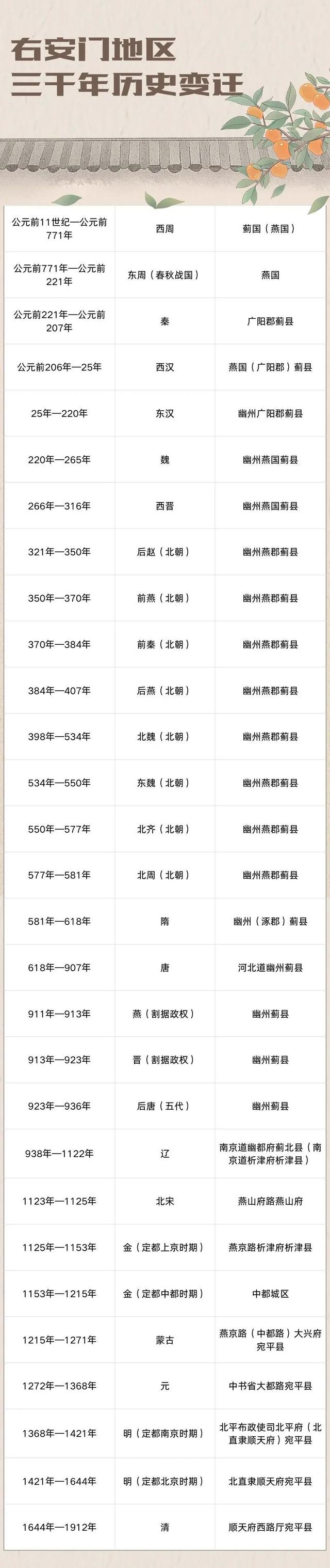 文章核心观点 - 文章系统梳理了北京右安门地区跨越约三千年的历史沿革、地理变迁与功能演变,从古代文明发祥地、金中都南城要地、明清京师外城雄关,最终蝶变为现代北京丰台区兼具深厚历史底蕴与当代发展活力的街道,展现了该区域持续的区位重要性与古今交融的现状 [1][6][9][14][16][21] 历史沿革与行政归属 - 右安门地区早在原始社会已有先民活动,1996年在其东北约7公里处发现距今约2.5万年的古人类文化遗址,2021年在其以南约5公里处发现距今约3500年的夏商时期环壕聚落遗址 [1] - 据记载,周武王灭商后封黄帝后代于“蓟”,古蓟城位于右安门地区西北约5公里,后该地区先后归属蓟国、燕国 [5] - 自东汉至隋朝,该地区在历代王朝中主要隶属幽州蓟县 [3] - 自唐朝至明朝,其行政归属随朝代更迭多次变化,先后隶属唐河北道幽州蓟县、辽南京道析津府析津县、金中都城区、元大都路宛平县、明顺天府宛平县等 [4] 地理与功能变迁 - 金朝天德三年(1151年)始建中都,贞元元年(1153年)迁都于此,北京实现从“城”到“都”的跨越,右安门地区随之从“郊区”跃升为“城区”,成为金中都南城要地 [6] - 金中都城周18.7公里,南城垣设三门,右安门地区位于景风门附近,是当时南城的交通与城防要地 [8] - 元朝营建大都城,北京城区整体向东北偏移,右安门地区再次回归郊区 [8] - 明嘉靖三十二年(1553年),为加强守备并容纳增长的人口,开始修建北京外城,右安门作为外城南侧城门之一被创建,其名沿用至今 [9][10] - 右安门城门营建历时近两百年,最终形成包含城楼、瓮城、箭楼的完整格局 [12] 现代发展与现状 - 1957年4月28日,北京市批准建立右安门办事处(后更名为街道办事处),辖区面积7.742平方千米,人口约1.3万人,下设10个居委会 [14] - 1958年5月24日行政区划调整后,右安门办事处正式划归丰台区管辖 [14] - 如今,右安门街道已成为兼具历史底蕴与现代活力的区域,拥有北京南站交通枢纽、凉水河生态水岸、金中都水关遗址等标志 [16] - 区域产业发展势头良好,中国出版集团、国网工研院等机构相继落户,拥有3个园区、11栋商务楼宇,提供64万平方米产业空间 [18] - 民生方面,已完成老旧小区改造全覆盖,构建三级养老服务网络,基层治理有效破解停车等难题 [18]