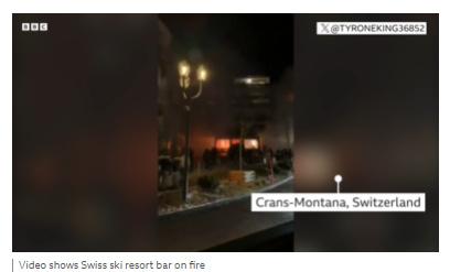 瑞士滑雪胜地突发爆炸,已造成多人伤亡 中新网1月1日电 据英国广播公司(BBC)援引瑞士警方消息,当地时间1月1日凌晨1时30分左右,瑞士阿 尔卑斯山区滑雪小镇克朗-蒙大拿一家酒吧发生爆炸,并发生火灾,目前已造成多人伤亡。 据报道,事发酒吧"星座"是当地热门游客聚集地。爆炸发生时,店内约有100多人,正在举行跨年庆祝 活动。伤亡人数可能进一步上升。 广告等商务合作,请点击这里 本文为转载内容,授权事宜请联系原著作权人 中新经纬版权所有,未经书面授权,任何单位及个人不得转载、摘编或以其它方式使用。 关注中新经纬微信公众号(微信搜索"中新经纬"或"jwview"),看更多精彩财经资讯。 图片来源:英国广播公司(BBC)报道截图 警方表示,事故原因尚不清楚,正在调查中。当地报道称事故原因可能涉及烟火,但尚未得到证实。 救援服务人员已抵达现场,更多细节正在持续公布中。 来源:中国新闻网 编辑:张嘉怡 ...